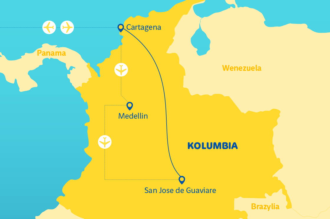 Snídaně a přelet do San José del Guaviare. Tato oblast, ačkoli je stále málo známá, skrývá bohatství, které dosud obdivovali jen jednotliví turisté. Především je však branou do Amazonie a jejích pokladů. Právě zde se nacházejí jedny z nejstarších skalních útvarů, prehistorické malby, pestrobarevná řeka (pouze od května do října) a zvířata (růžoví delfíni, ptáci, opice). San José del Guaviare je navíc dokonalým příkladem proměny po podepsání míru v roce 2016, kdy zde odzbrojení partyzáni z FARC a další ozbrojenci našli uplatnění, i když jen v cestovním ruchu. Mimo jiné právě zde dostali šanci na jiný život farmáři, kteří pěstovali koks. V tento den je na programu Puerta de Orion neboli Orionova brána, ze které, jak praví legenda, budete moci spatřit souhvězdí. Abyste se tam dostali, budete se muset prodírat lesem jako Indiana Jones - uvidíte liány, dlouhé kořeny visící z mohutných skalních útvarů, díky nimž budete mít pocit, že jste se přesunuli do jiného ztraceného světa. Večeře a přenocování.
