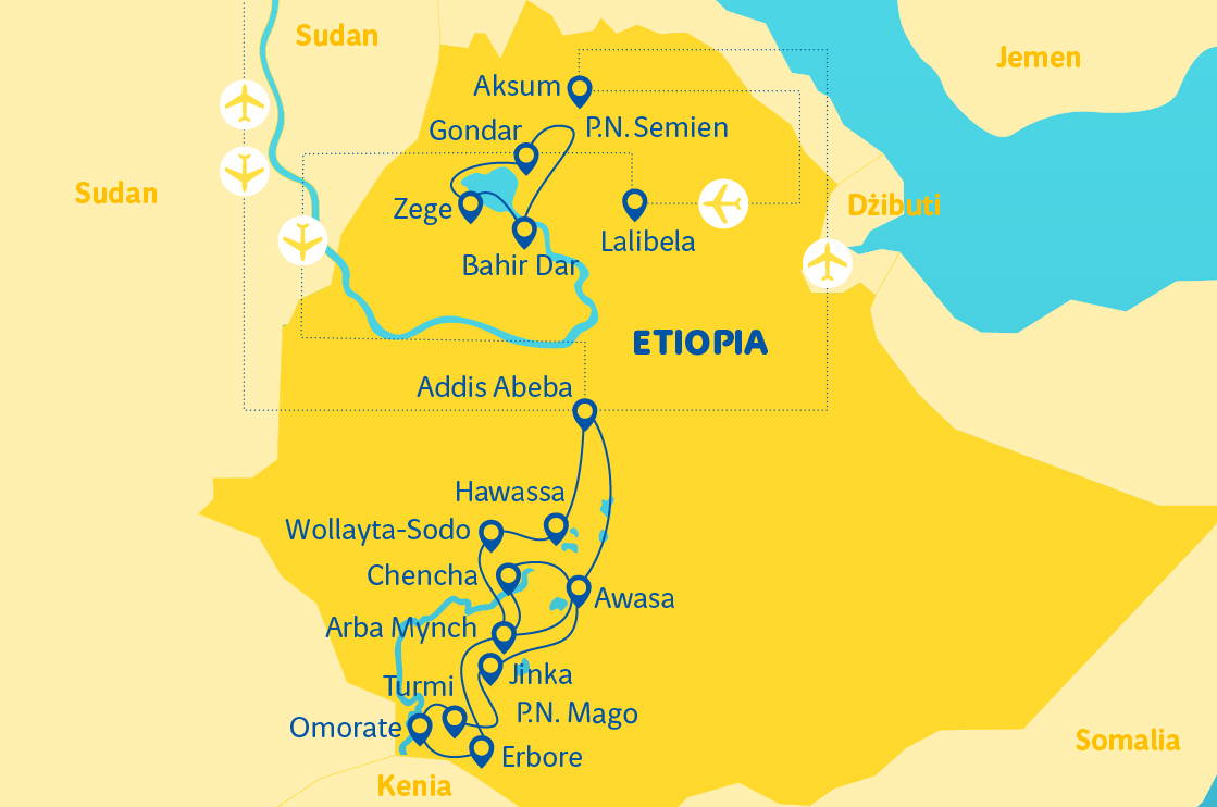Základní cena zahrnuje: přelet letadlem společnosti Turkish Airlines (s přestupem v Istanbulu), ubytování v hotelech nebo lodgích dle specifikace - 15 nocí, 2 vnitřní přelety dle programu ((3 v případě návratu letů do Aksúmu), letištní taxy, stravování dle programu: snídaně a večeře (s výjimkou ubytování v Istanbulu), turistický program, plavba po jezeře Čamo, transfery: letiště - hotel - letiště, přejezdy 20místným autobusem (se zavazadly na střeše), služby polského průvodce během celého poznávacího zájezdu, místního průvodce - vedoucího skupiny, místních průvodců, pojištění TU Europa varianta základní (úrazové pojištění a léčebné výlohy, trvalé následky, asistenční služby a pojištění zavazadel).