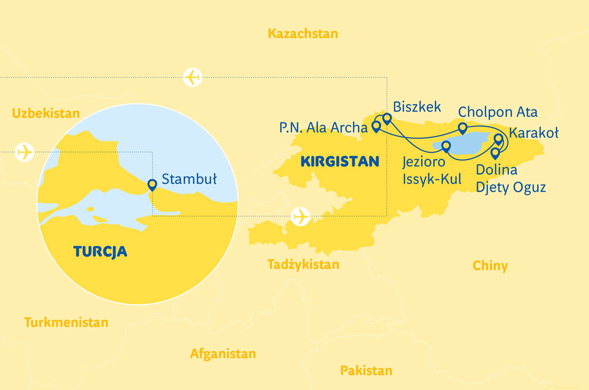 Cena zahrnuje:let na trase Varšava-Istanbul-Biškek-Varšava, let na trase Istanbul-Biškek, letištní poplatky, ubytování v hotelech 3*** a 4**** (9 započatých nocí v hotelu), stravování dle programu, transfery klimatizovaným autokarem, turistický program dle výše uvedeného, péči polského pilota a místních průvodců, pojištění TU Europa varianta základní (úrazové pojištění a léčebné výlohy, trvalé následky, asistenční služby a pojištění zavazadel).