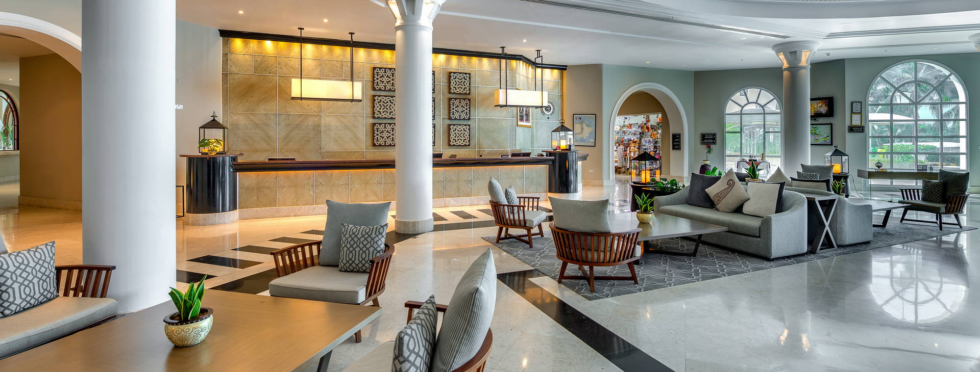 .V trojpodlažnej budove sa nachádza: V budove sa nachádza 24-hodinová recepcia s priestrannou elegantnou vstupnou halou, 4 výťahy, zmenáreň a obchody so suvenírmi, šperkami a kozmetikou. Hostia hotela si môžu vychutnať hlavnú reštauráciu v štýle bufetu (medzinárodná kuchyňa), ako aj jednu z piatich tematických a la carte reštaurácií, medzi ktoré patria: steakhouse, morské plody (za príplatok, nutná rezervácia vopred), a 3 bary: priestranný lobby bar, bar pri bazéne a bar na pláži. V areáli hotela, v blízkosti pláže, sa nachádza vonkajší bazén v tvare lagúny (pravidelne vyhrievaný) s detským bazénom a malou šmýkačkou. Ležadlá, slnečníky a osušky pri bazéne sú k dispozícii zadarmo.