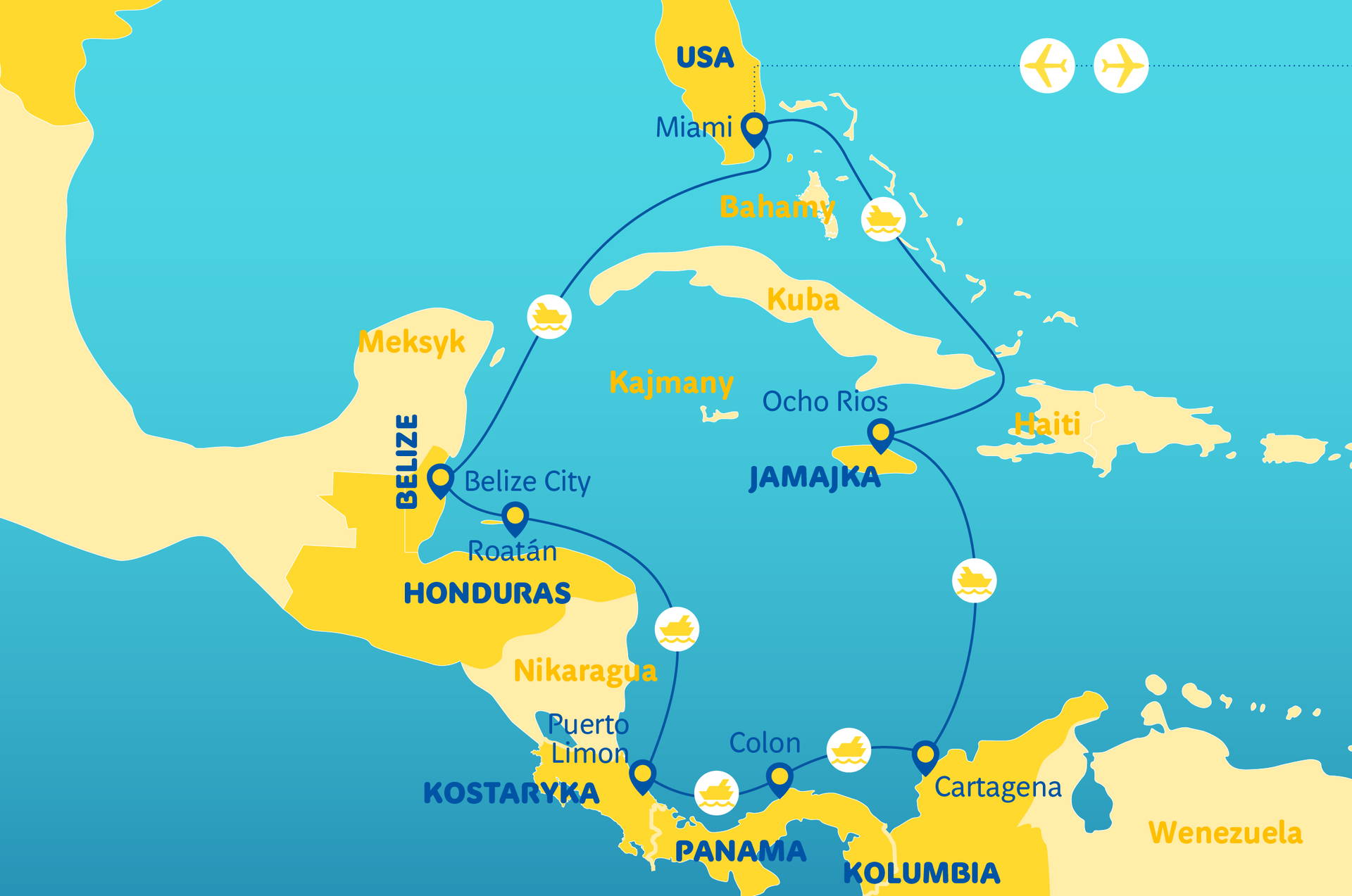 MSC Poesia plavba • Exotické Ocho Ríos na Jamajce • Cartagena – koloniální perla Karibiku • Colon v Panamě • Tropická příroda v Puerto Limón v Kostarice • Korálové útesy u ostrova Roatán • Kouzelné Belize City • Prohlídka živého Miami