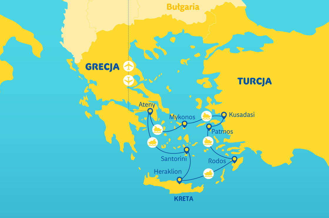 Atény: Akropole, procházka čtvrtí Plaka, starověká Agora, Panathénský stadion, náměstí Monastiraki • Mykonos • Kusadasi • Efez • Patmos • Rhodos • Kréta (Heraklion – palác v Knóssu) • Santorini • loď Celestyal Discovery**** • 3 jídla na lodi • polský průvodce na palubě lodi!• přístavní poplatky v ceně !• Základní balíček WiFi v ceně