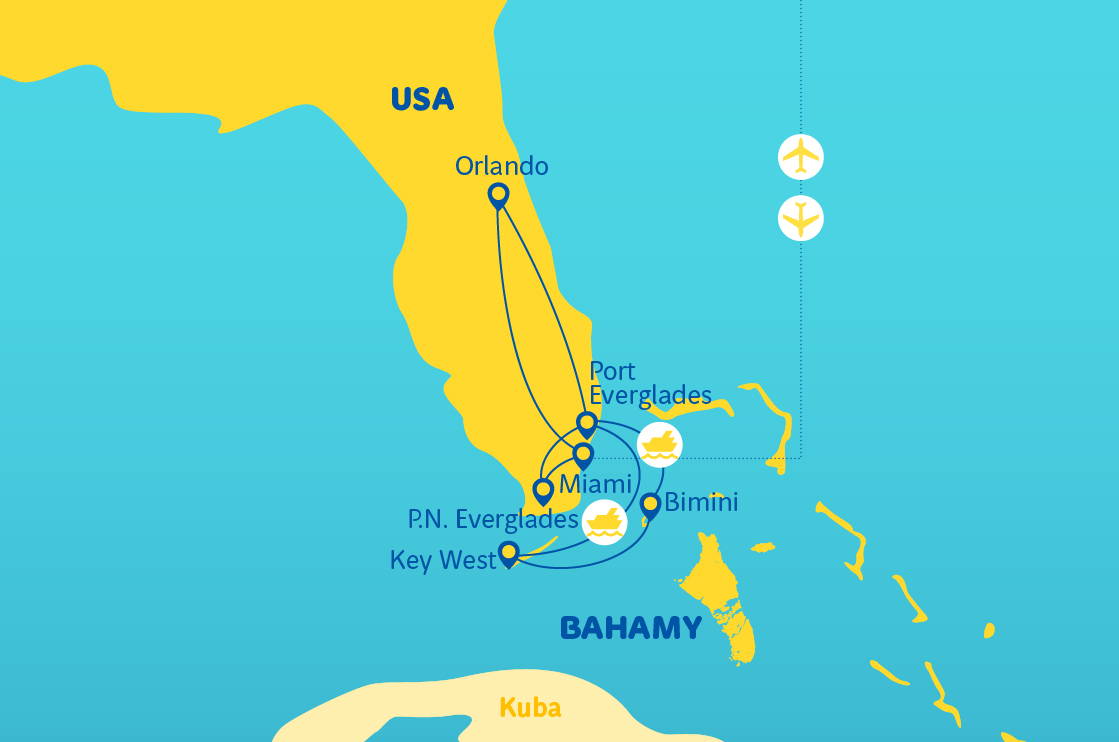 Dvě hodiny před odletem se dostavte k odbavovací přepážce Rainbow. Odlet z Varšavy a odlet do USA (možnost přestupů). Aktuální letové řády naleznete na adrese: R.pl/schedules. Přílet do Miami, pasové odbavení dle platných vízových procedur, setkání s pilotem, transfer do hotelu v blízkosti Miami, odpočinek a přenocování. (Trasa cca 50 km)