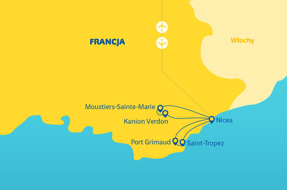 Cena zahrnuje: letenku na trase Varšava-Nice-Varšava, letištní poplatky, ubytování v Nice (4 započaté noci v hotelu), transfery klimatizovaným autokarem, stravování: snídaně, výše uvedený turistický program, péči polského pilota během cesty, pojištění TU Europa (NNW, KL, CP, Assistance a zavazadla).