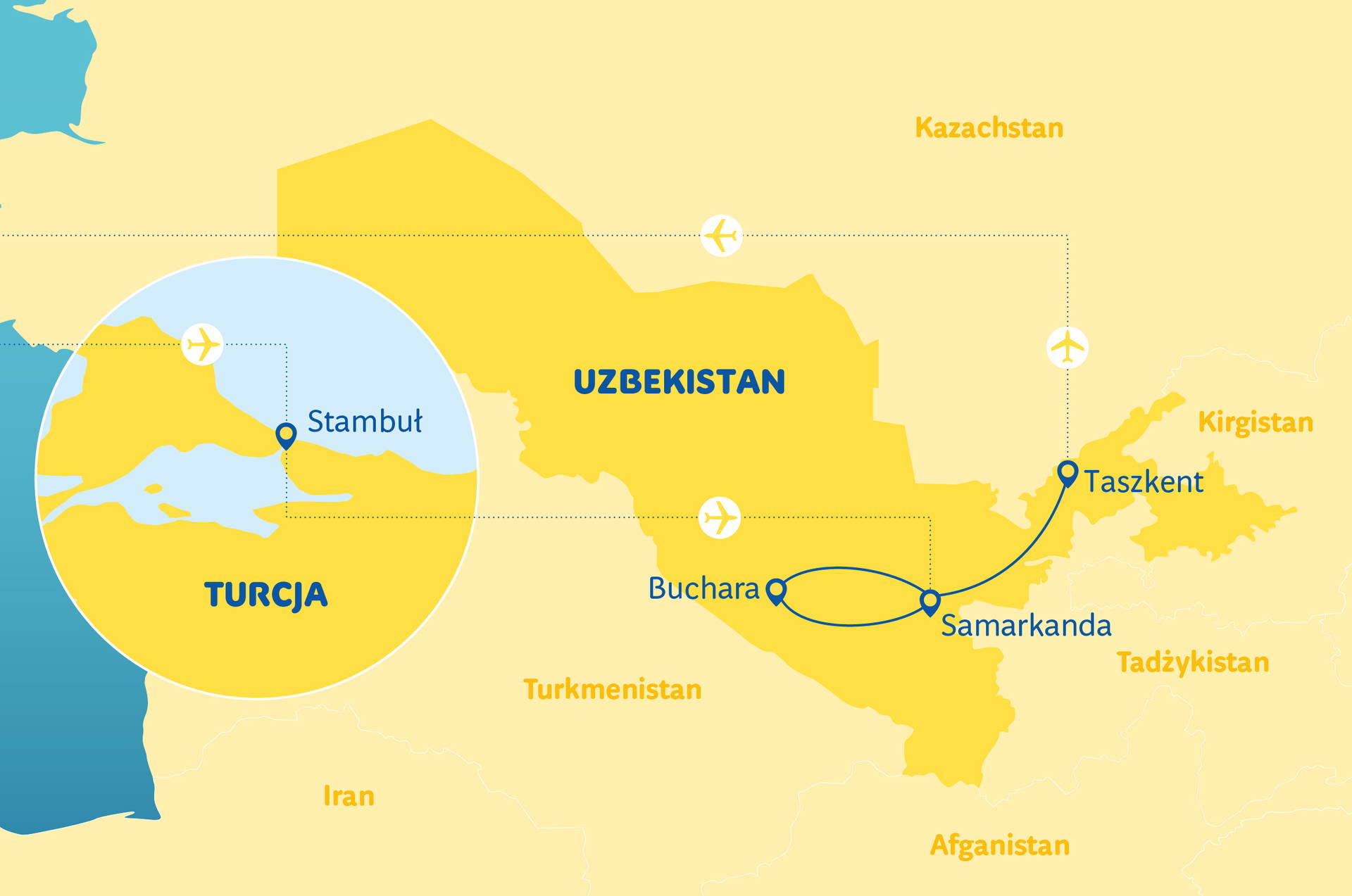 Cena zahrnuje:let na trase Varšava - Istanbul - Taškent - Varšava, vnitřní přelet Istanbul - Taškent, letištní poplatky, ubytování v hotelech 3*** a 4**** (9 započatých hotelových nocí), stravování dle programu, transfery klimatizovaným autokarem, turistický program dle výše uvedeného, péči polského pilota a místních průvodců, pojištění TU Europa varianta základní (úrazové pojištění a léčebné výlohy, trvalé následky, asistenční služby a pojištění zavazadel).