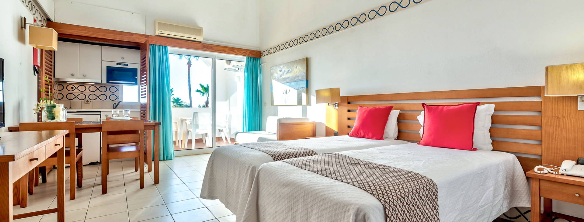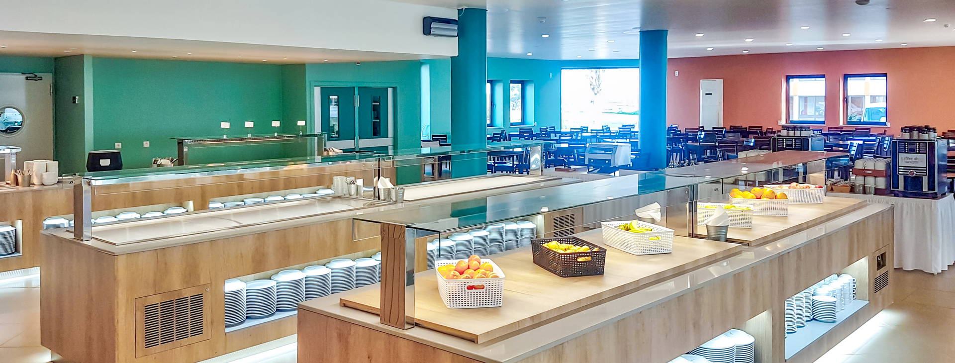 Raňajky, obedy a večere sa podávajú formou bufetu v reštaurácii Amerelo. Okrem stravovania formou All Inclusive sú k dispozícii dva bary ("Snack-bar -A Vela" pri bazéne a "Ria Cafe" pri fitnes klube).