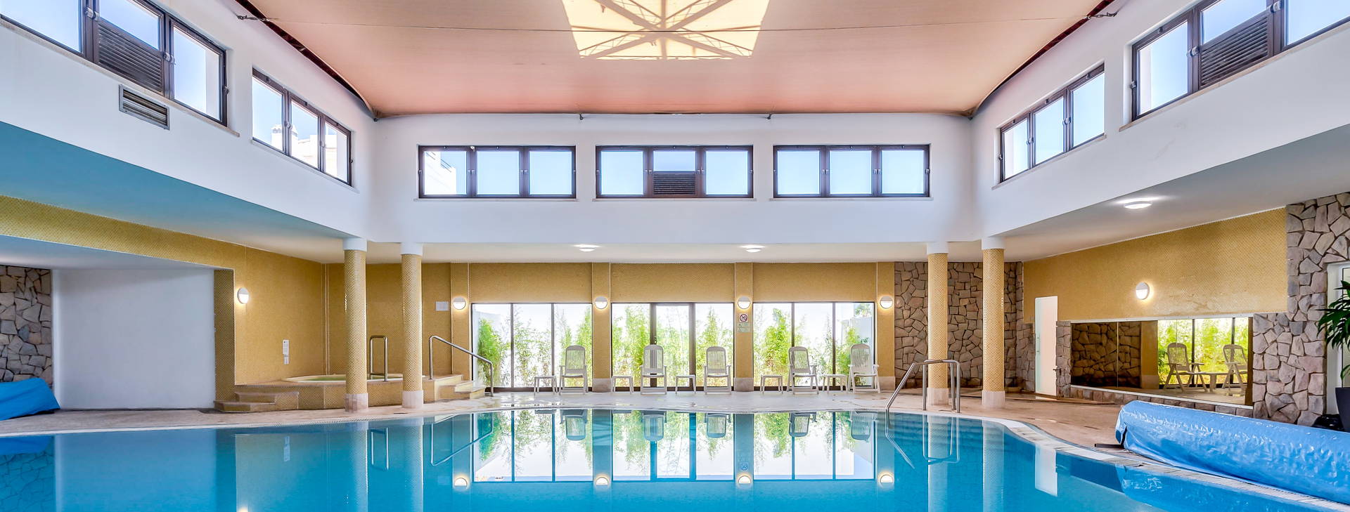 Hlavný bazén nepravidelného tvaru a druhý vonkajší bazén v odľahlej časti pre tých, ktorí hľadajú pokoj a ticho. Pre úplnú relaxáciu môžete využiť vírivku, saunu, parný kúpeľ alebo masážnu miestnosť.