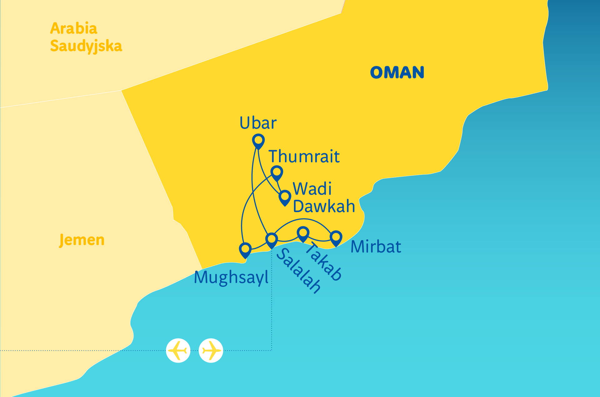 Základní cena zahrnuje: přelet letadlem, letištní taxy, transfery klimatizovaným autokarem nebo minibusem (možné přejezdy džípy 4x4 ve vybraných bodech programu), ubytování v hotelech dle programu: během poznávací části (4 noci v Salále nebo okolí) a ve vybraném hotelu během pobytové části (3 noci), stravování během poznávací části: snídaně (4); během pobytu stravování dle popisu vybraného hotelu, služby polského zástupce během odbavení na letišti, služby polského průvodce nebo polsky mluvícího zástupce místního kontrahenta během poznávací a pobytové části, turistický program (viz níže), pojištění TU Europa varianta základní (úrazové pojištění a léčebné výlohy, trvalé následky, asistenční služby a pojištění zavazadel).