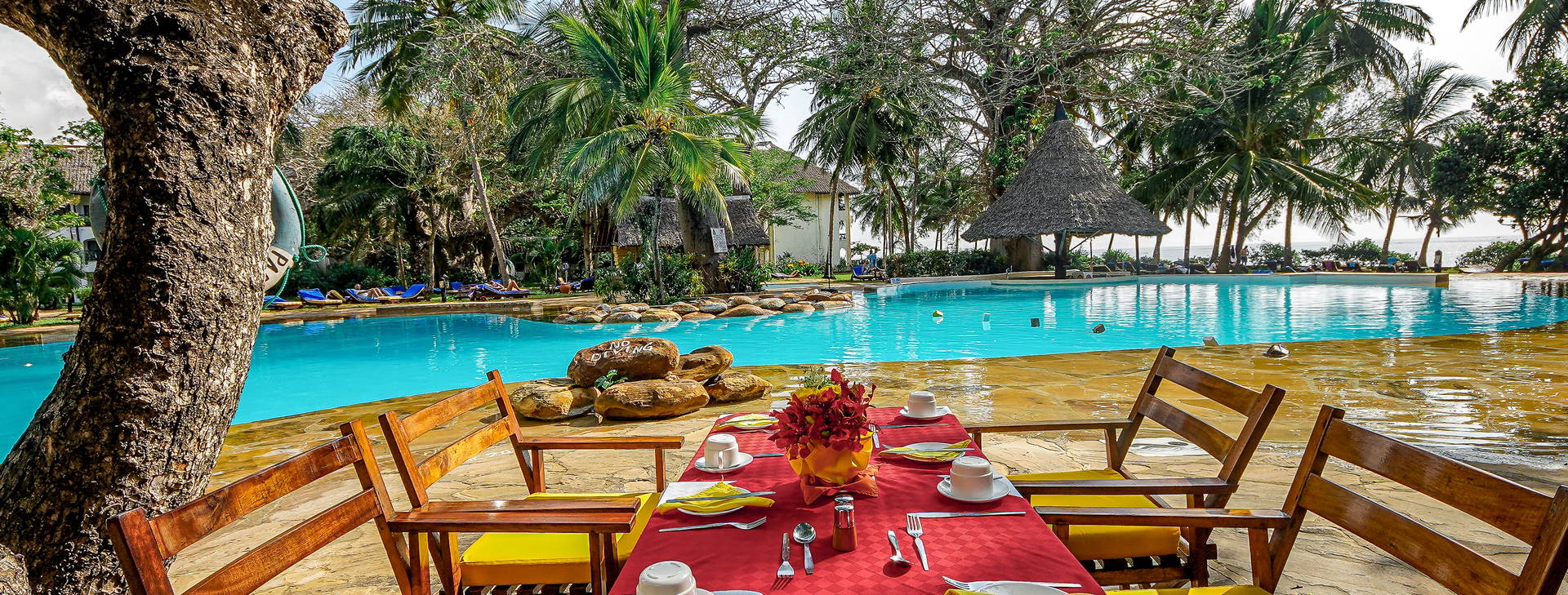 Hotel sa nachádza na južnom pobreží Mombasy, obklopený nádhernými palmami a fenomenálnymi storočnými baobabmi, ktoré sú domovom vzácnych živočíšnych exemplárov. Hotel je postavený v miestnom svahilskom štýle a pozostáva z 5 viacposchodových bungalovov rozmiestnených po celom hoteli. Najbližšie obchody sa nachádzajú v malej dedinke Diani, približne 3 km od hotela. Letisko Mombasa je vzdialené približne 50 km.