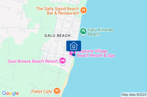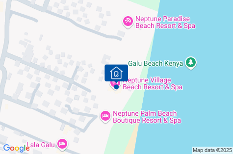 Hotel Neptune Paradise Beach Resort & SPA sa nachádza priamo pri širokej, verejnej piesočnej pláži Galu (pokračovanie pláže Diani). Ležadlá, slnečníky a plážové osušky sú k dispozícii v hotelovej záhrade pri pláži - zadarmo.