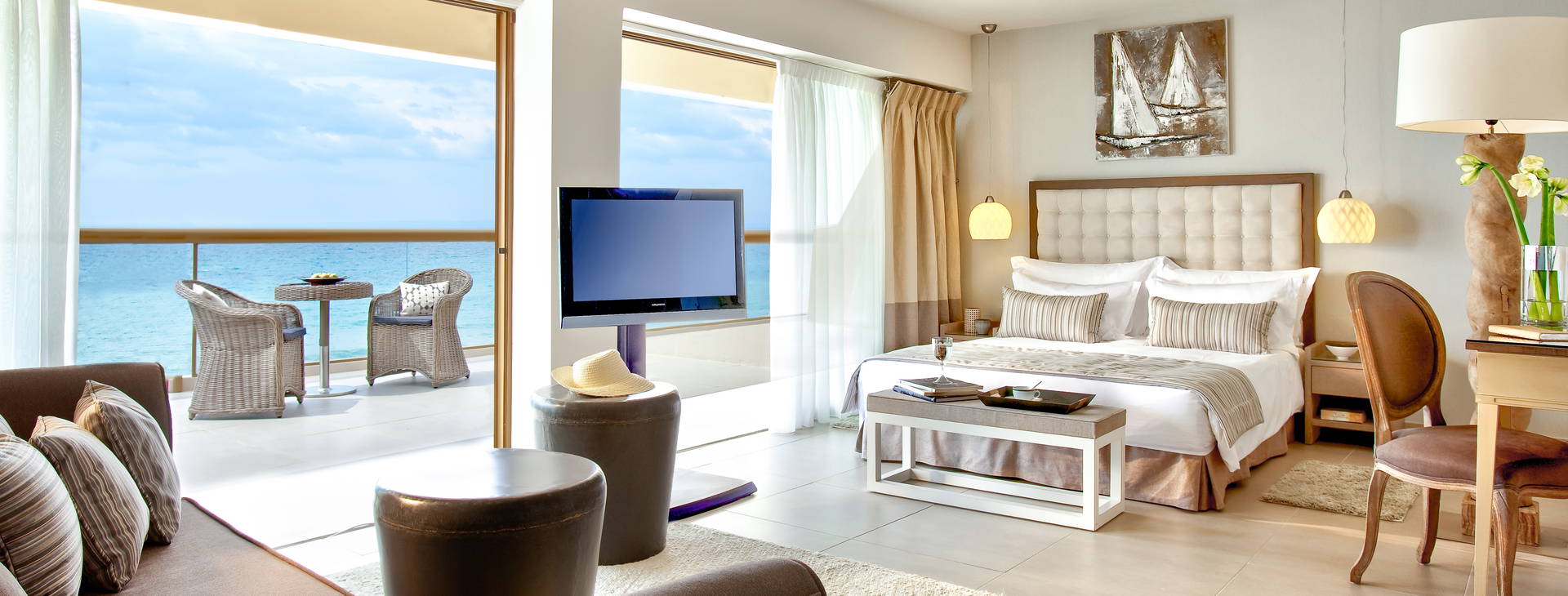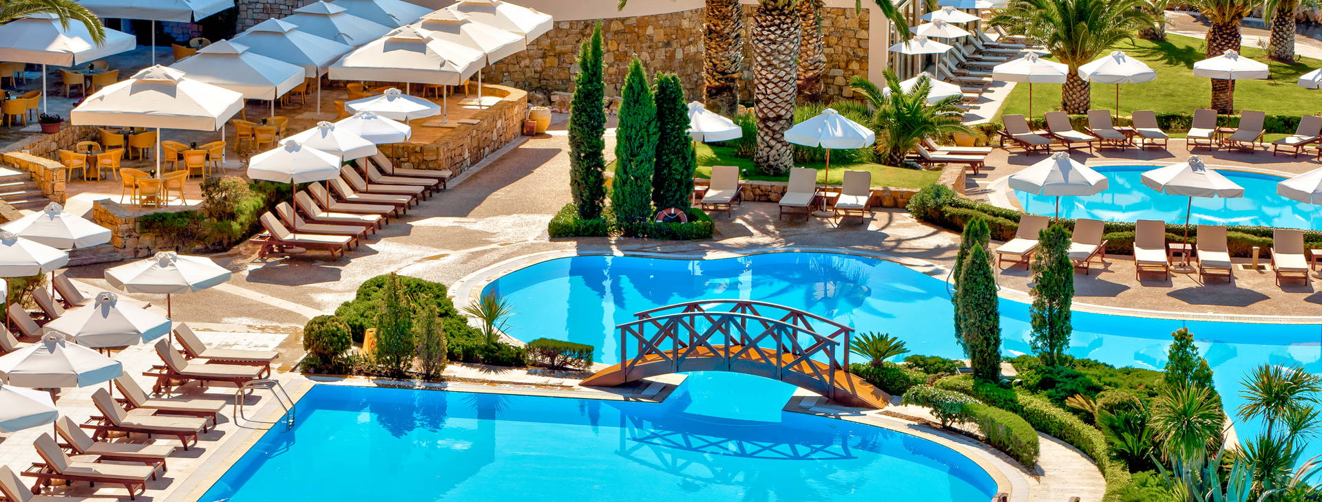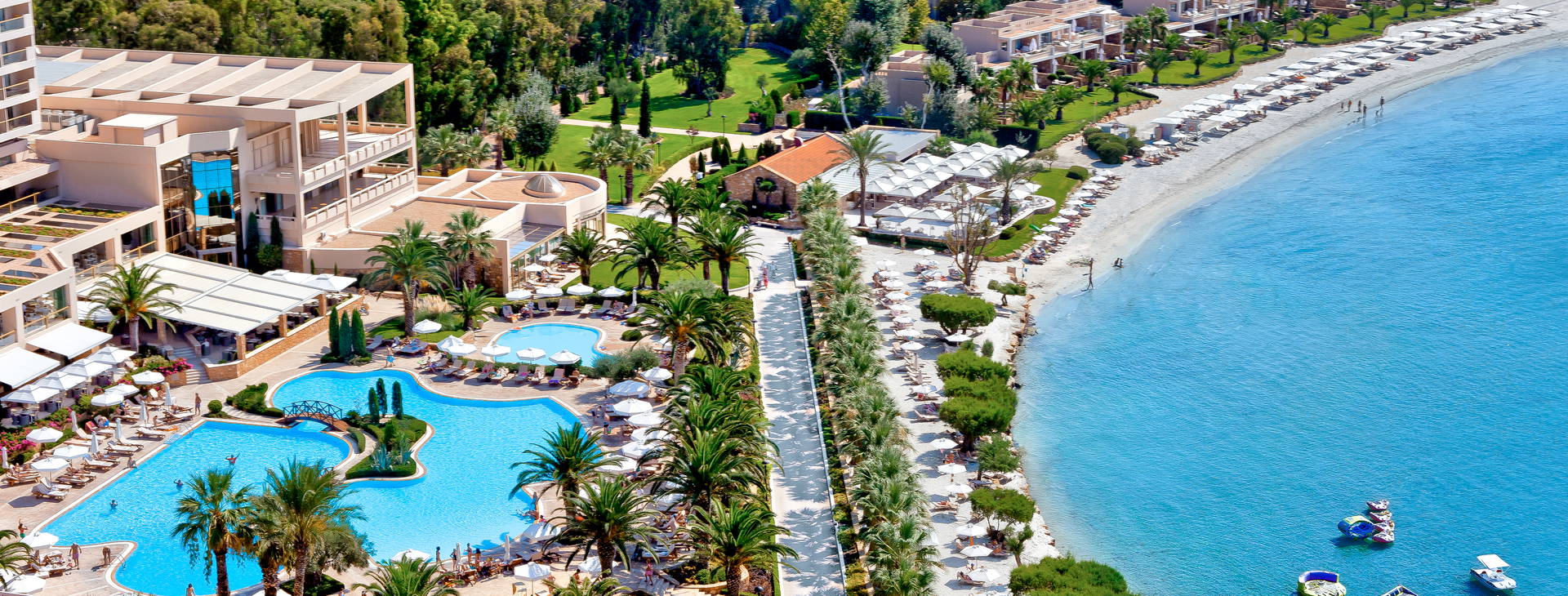 Raňajky a večera. Hotel má štyri reštaurácie, z toho tri a la carte, v ktorých sa podávajú jedlá gréckej a medzinárodnej kuchyne.