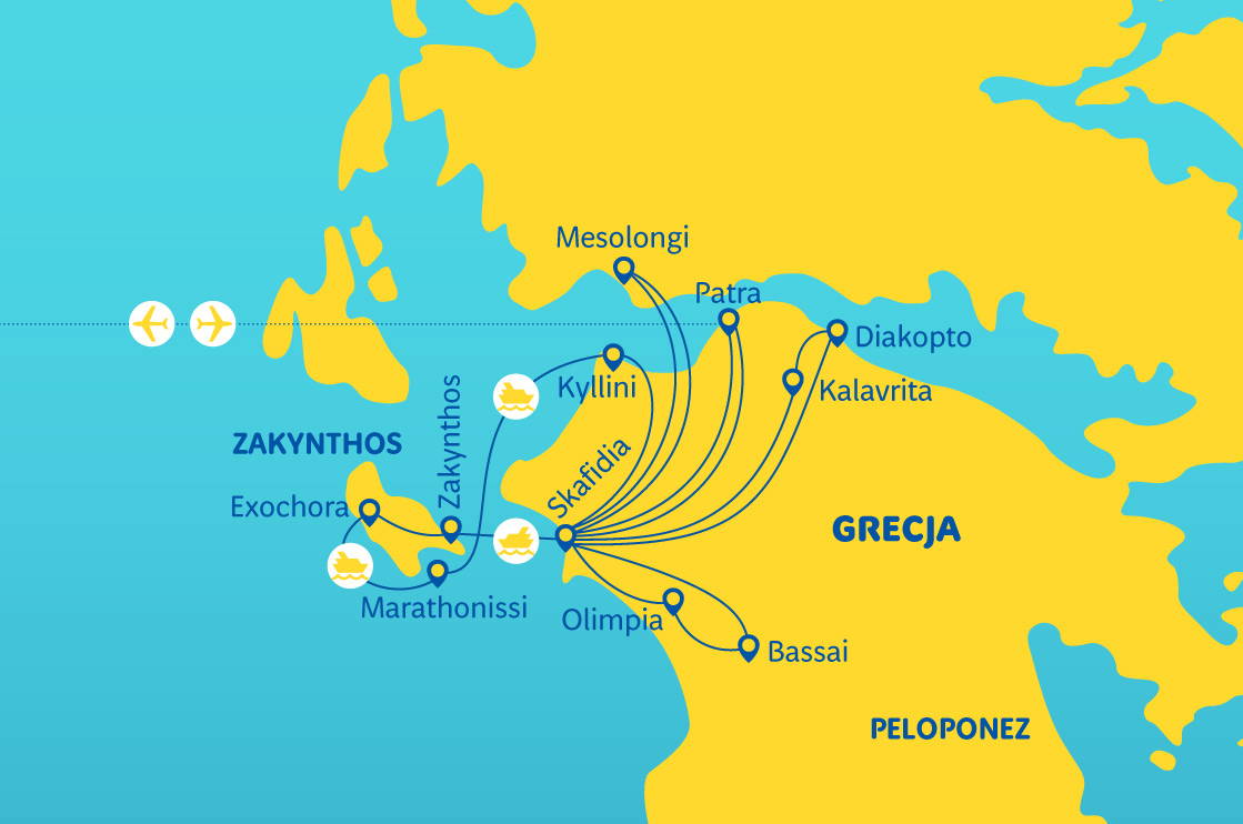 Po snídani odplujeme na jeden z nejkrásnějších jónských ostrovů - Zakynthos. Je proslulý svými bílými písečnými plážemi, majestátními útesy a modrými jeskyněmi, které nadchnou cestovatele z celého světa. Je také jednou z nejvýznamnějších rezervací želv Caretta Caretta, které si již po staletí vybírají jižní pláže ostrova jako místo pro kladení vajec - tento druh je nyní pod přísnou ochranou. Navštívíme vesnici Exochora, kde roste nejstarší olivovník na ostrově, skutečná přírodní památka. Poté se vydáme na plavbu za hledáním těchto mořských želv a také na malebnou pláž Marathonissi - ideální ke koupání a fotografování (plavba se uskuteční v případě příznivého počasí). Během plavby pocítíme kouzlo řeckého pobřeží, které v sobě spojuje přírodní krásy s historií. Návrat do přístavu, přejezd trajektem do Kyllini a návrat do hotelu.
