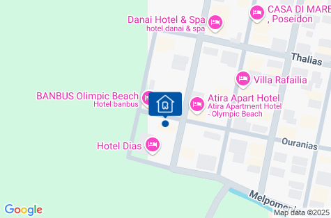 Hotel sa nachádza v pokojnom kúte obľúbeného turistického letoviska Olympic Beach v oblasti Pieria, na úpätí hory Olymp. Hotel je vzdialený približne 250 m od centra mesta a pozdĺž pobrežia vedie promenáda (cca 2 km) do susednej rušnej Paralie. Tam nájdete širokú ponuku dovolenkových aktivít. Katerini, hlavné mesto regiónu Pieria, je vzdialené približne 8 km. Transfer z letiska do hotela trvá približne 2 h. Cena nezahŕňa miestnu turistickú daň vo výške 1,50 EUR/izba/deň. Táto daň je povinná a platí sa priamo na recepcii pred ubytovaním klientov v hoteli