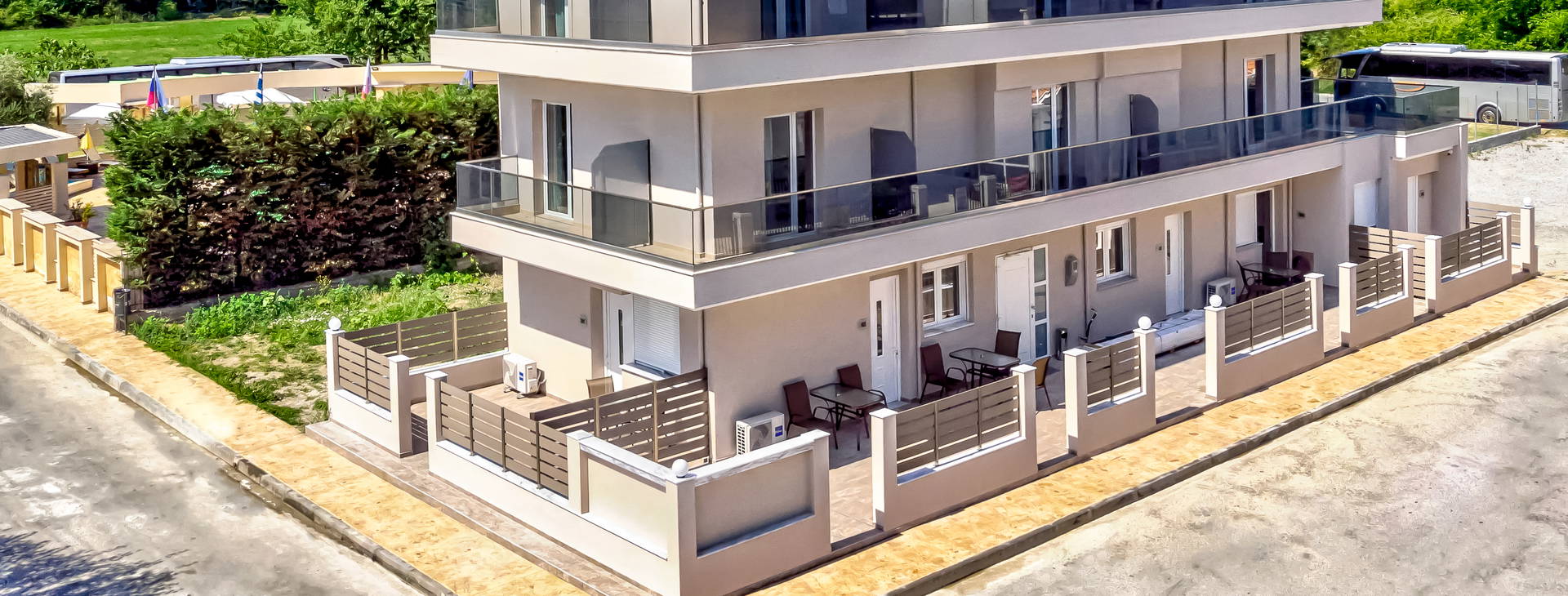 Rezidencia sa nachádza približne 450 m od mora a širokej piesočnatej pláže. Ležadlá a slnečníky - za poplatok, cca 5-6 EUR/komplet alebo pri objednaní niečoho na pitie v plážovom bare - zdarma