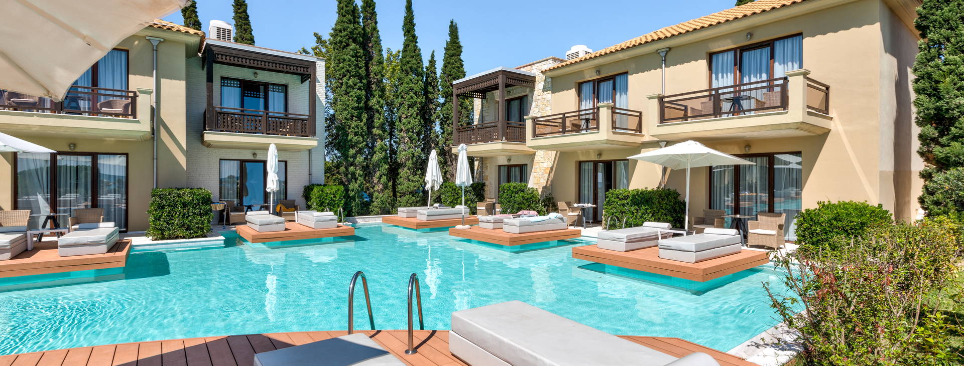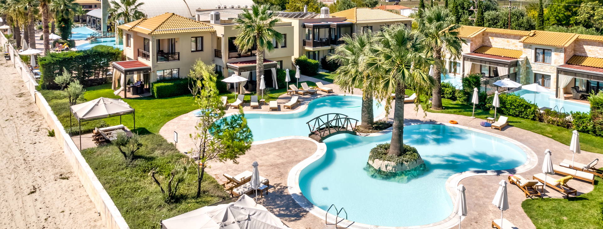 Hotel postavený v roku 2009. Hotel pozostáva z niekoľkých jednoposchodových budov obklopených palmami. Recepcia je k dispozícii 24 hodín denne. S lobby, minimarket, zlatníctvo, detské ihrisko, úschovňa batožiny (zdarma), zmenáreň, klimatizovaná hlavná reštaurácia s terasou (vysoké stoličky pre deti zdarma), 3 bary (TV, v hlavnom bare). a la carte reštaurácia s gréckou a medzinárodnou kuchyňou (za poplatok), niekoľko bazénov zaujímavých tvarov vrátane jedného vnútorného vyhrievaného bazéna a detského brodítka (všetky bazény so sladkou vodou), ležadlá a slnečníky pri bazéne - zdarma, osušky (vratná kaucia cca 1,5 mil. Kč), bazén s výhľadom na more (za poplatok). Hotel prijíma platobné karty. Hotel ponúka aj 24-hodinovú izbovú službu.