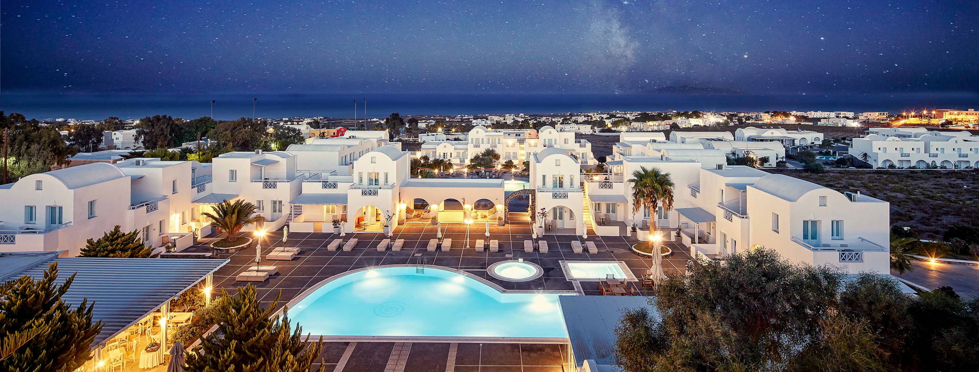 El Greco Resort & SPA je najväčší a najrozsiahlejší hotel na ostrove Santorini. Kaskádovito sa zvažuje zo svahu útesu a svojim klientom ponúka 5 bazénov, bary a reštauráciu. Hotel sa nachádza v hlavnom meste ostrova Fira, niekoľko minút chôdze od centra. Fira je skutočné typické kykladské mesto - týči sa na strmých útesoch a je plné farieb a atmosféry. Oplatí sa prejsť a vychutnať si toto miesto alebo sa zastaviť v jednej z mnohých kaviarní, ktoré sa nachádzajú takmer nad priepasťou a ponúkajú úchvatný a jedinečný výhľad. Oia, známa najkrajšími západmi slnka, je od hotela vzdialená asi 10 km a letisko asi 5 km.