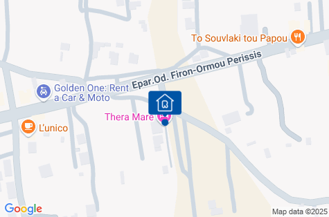 Hotel Thera Mare sa nachádza na známej "Čiernej pláži" v Perivolose, 700 m od mesta Perissa a len 12 km od mesta Fira. V blízkosti hotela sa nachádza niekoľko kaviarní a reštaurácií, v ktorých sa podávajú miestne špeciality. Transfer z letiska trvá približne 30 minút.