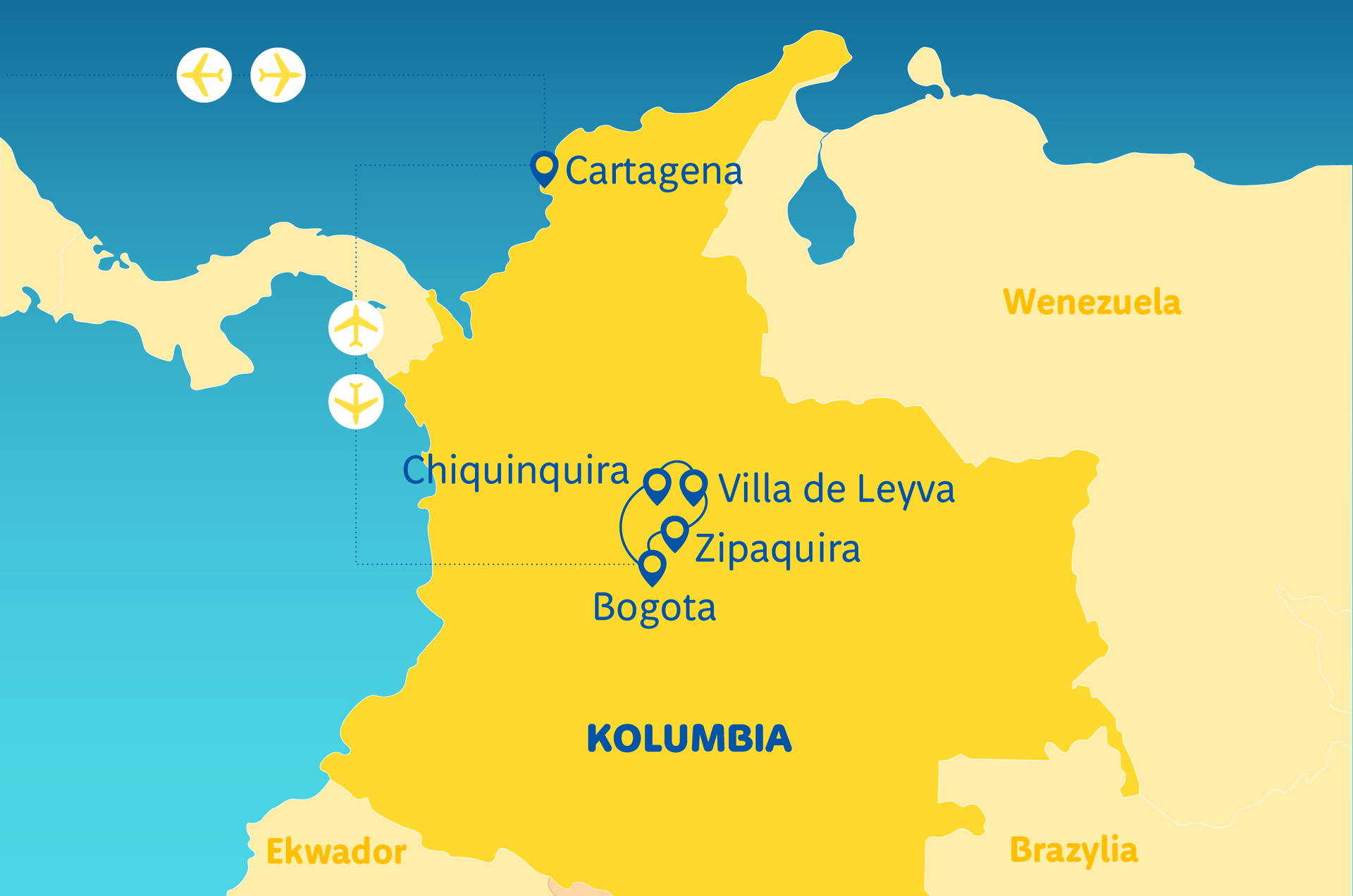 Po snídani přejezd do Zipaquiry, malebného městečka v Andách, které pamatuje doby španělské kolonizace svou zachovalou architekturou z tohoto období. Město je proslulé svým solným dolem, který je dodnes v provozu, přičemž první dvě patra podzemí jsou přístupná turistům. V kulisách solných chodeb a komor bývalých důlních prostor byla uspořádána solná katedrála - Catedral del Sal. Při prohlídce stavby projdete křížovou cestou vytesanou ve skále, poutavě osvětlenými místnostmi, z nichž největší má loď. Katedrála je řazena mezi sedm divů Kolumbie. Právě v tomto dole se kdysi těžilo 70 % veškeré kolumbijské soli. Odpoledne odjezd směrem na Villa de Leyva, ubytování v hotelu, večerní procházka městem. Villa de Leyva má největší náměstí v Kolumbii a byla dějištěm jednoho z dílů polského seriálu Master Chef. Nádherně vypadá večer, kdy jsou koloniální budovy osvětleny. Tato scenérie je také velmi oblíbená u Kolumbijců pro svatby. Večeře, nocleh (trasa cca 200 km).
