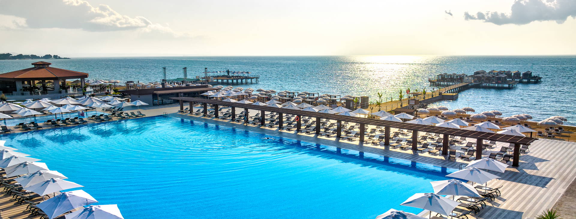 Ultra All Inclusive zahŕňa: raňajky (07:00-10:00), neskoré raňajky (10:00-11:00), obedy (12:30-14:30), večere (19:00-21:30) a nočný bufet (23:00-01:00) v hlavnej reštaurácii "Crystal". Okrem toho občerstvenie podávané v hlavnej reštaurácii s občerstvením (14:30-16:30) a v gastro zóne (14:30-17:00), ako aj zmrzlina (12:30-18:00). V reštaurácii "De Flamingos" je k dispozícii káva, čaj a nealkoholické nápoje (10:00-23:00) a zákusky (11:00-19:00). Miestne alkoholické a nealkoholické nápoje, koktaily, káva, čaj sa podávajú v hlavnom bare (24 hodín) a v bare pri bazéne (08:00-00:00). Nealkoholické nápoje, káva a čaj sú k dispozícii v lobby bare (08:00-00:00). Za príplatok a na základe rezervácie sú k dispozícii 4 a la carte reštaurácie ("Asik Baba", talianska "Toscano", "Seafood" a "Beach").