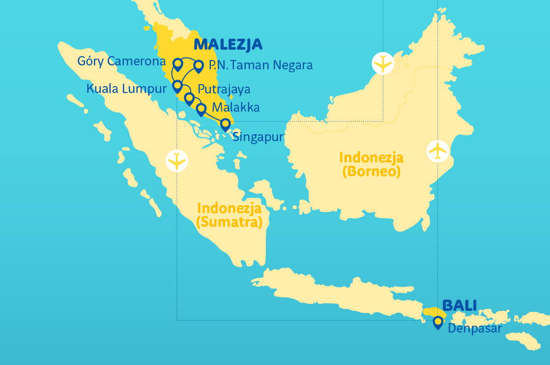 Cena zahrnuje: let na trase Varšava-Singapur-Varšava, letenku (přímou nebo nepřímou), ubytování v hotelu (12 rezervovaných nocí), let místní leteckou společností na trase Kuala Lumpur-Denpasar a Denpasar-Singapur, transfery klimatizovaným autokarem, stravování dle programu, doprovod polského pilota a místních průvodců, turistický program dle výše uvedeného. a pojištění TU Europa (NNW, KL a zavazadla).