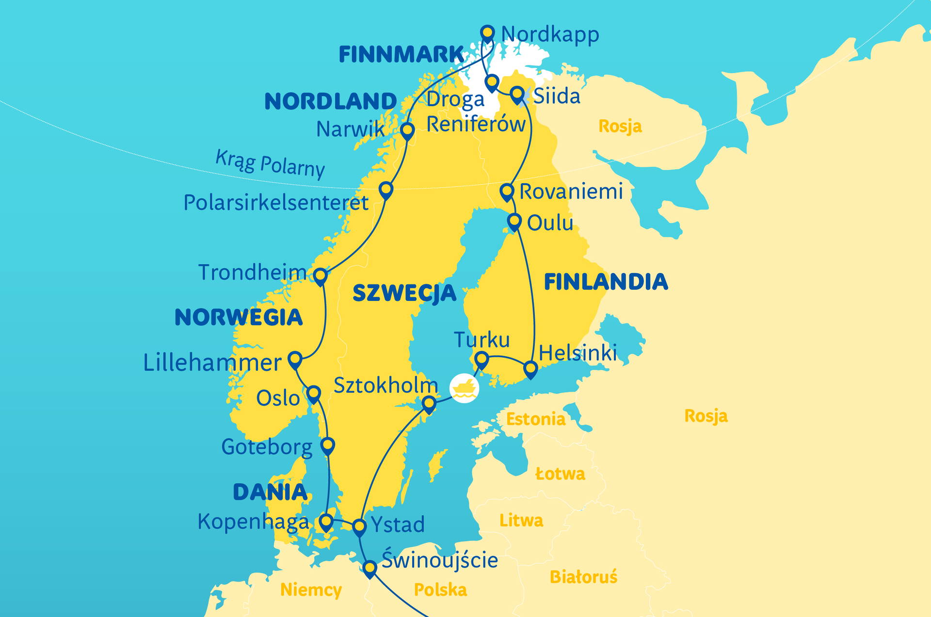 Kodaň - Malá mořská víla • norská města - Oslo a Trondheim • majestátní fjordy • polární kruh • Nordkapp - na to nezapomenete! • silnice sobů v Laponsku • Rovaniemi - Santa Claus Village (vesnička Santa Clause) • dvě hlavní města - Helsinky a Stockholm • plavba trajektem na trase Turku - Stockholm