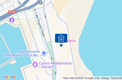Hotel známeho reťazca Melia sa nachádza asi 500 metrov od centra Alicante, pri mori, s výhľadom na stredovekú pevnosť. V bezprostrednej blízkosti sa nachádza autobusová zastávka, reštaurácie a múzeum. Domáce zvieratá nie sú povolené. Hotel je prispôsobený pre osoby so zdravotným postihnutím. V tej istej budove sa nachádza oddelená časť The Level (len pre dospelých).
