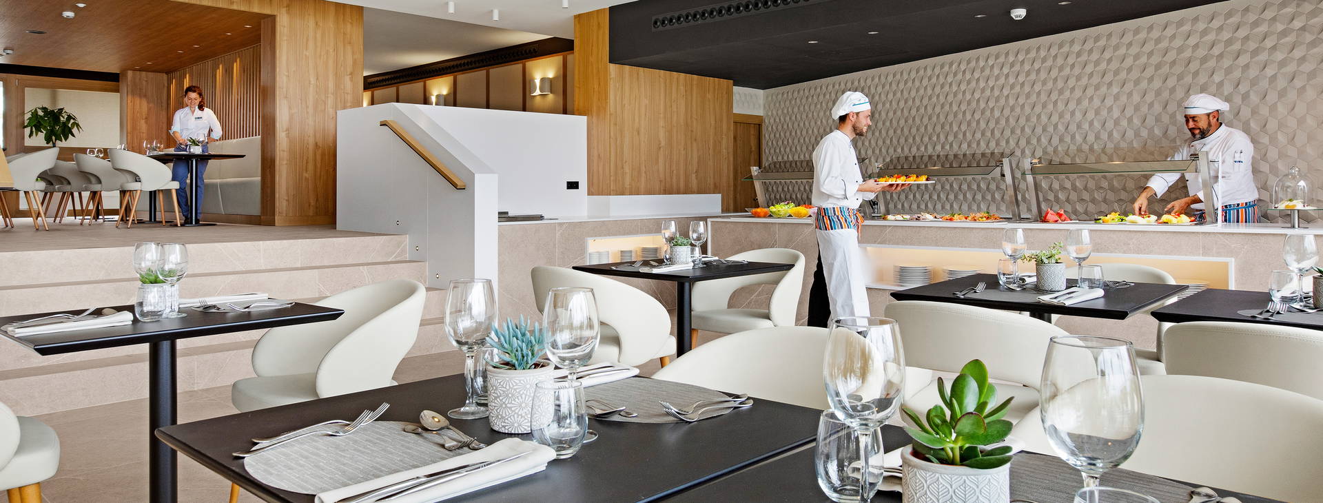 Sa raňajky sa podávajú formou pestrého bufetu. Za príplatok možnosť polpenzie (raňajky a večera), možnosť polpenzie deluxe (raňajky a večera v reštaurácii Adagio, prípadne raňajky a večera a la carte v reštaurácii Mirablau) alebo možnosť plnej penzie (raňajky a večera v reštaurácii Adagio, prípadne raňajky a večera v reštaurácii Mirablau, plus obed v reštaurácii Mirablau).