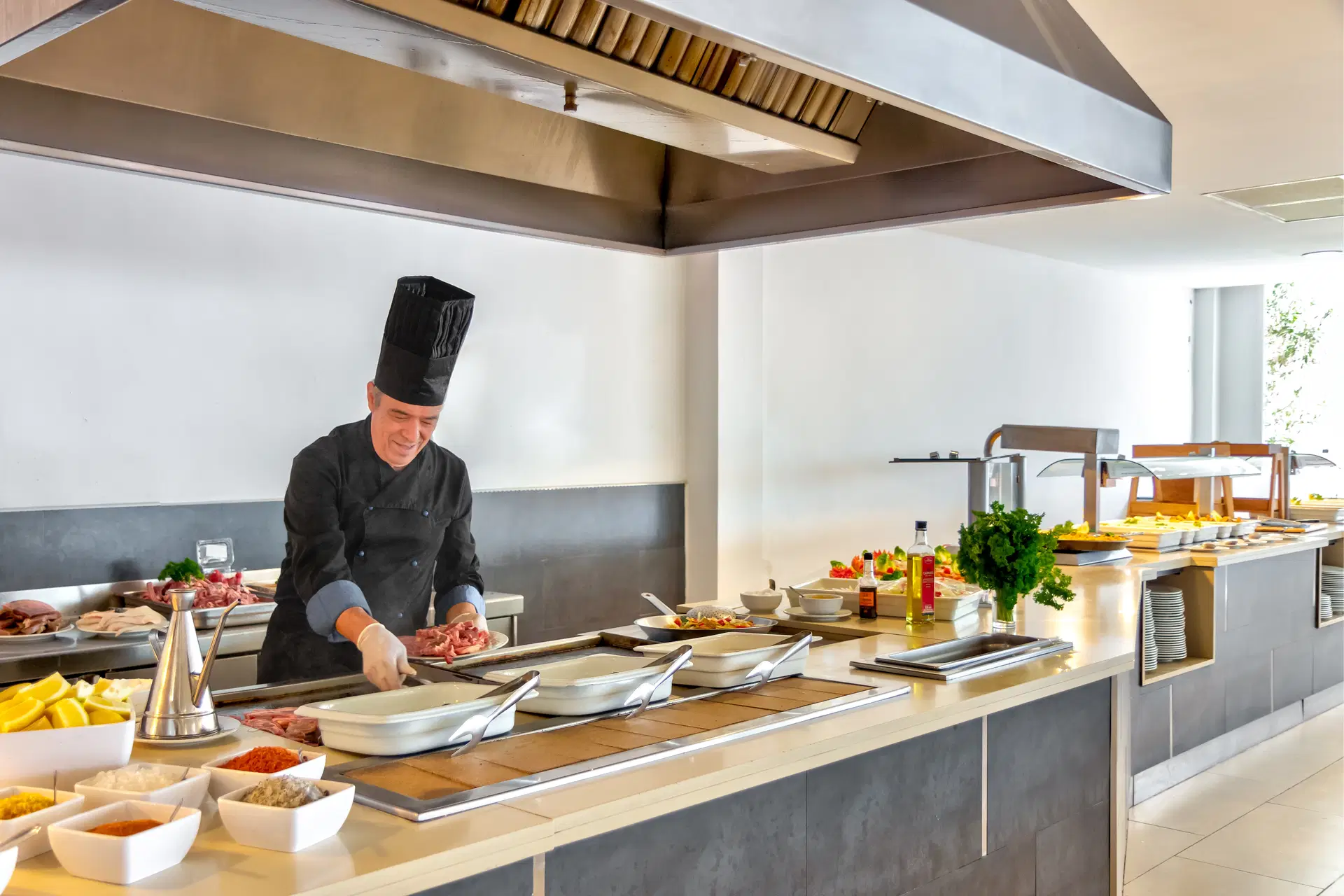 .All Inclusive: raňajky (08:00-10:00), obed (13:00-15:00) a večera (19:30-21:30) - formou bufetu v hlavnej reštaurácii. Medzi jedlami studené a teplé občerstvenie, káva, čaj, koláč, zmrzlina. Miestne nealkoholické a alkoholické nápoje podávané v bare (10:30-22:30). Víno, pivo, voda a nápoje počas jedál. Povinnosť nosiť náramok All Inclusive, za ktorý sa neúčtuje záloha.