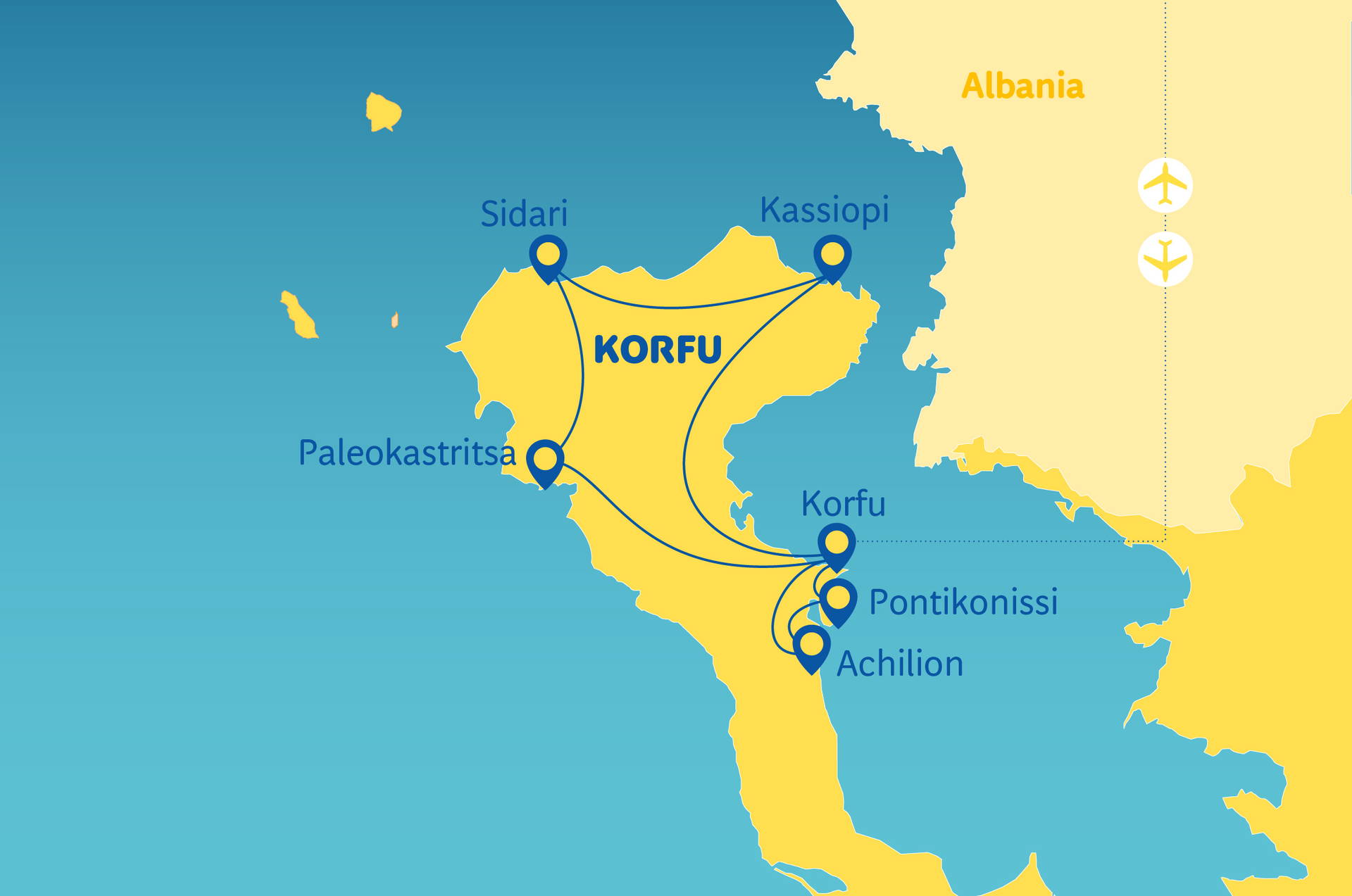 Mouse Island (Myší ostrov) a ulice Liston • Paleokastritsa, BellaVista • Sever - Kanál lásky - Kassiopi - přístav a pláž Imerolia • pro zájemce možnost prohlídky Modrých jeskyní a pohádkových zátok v blízkosti ostrovů Paxos a Antipaxos a Albánie - možnost prodloužení pobytu na Korfu