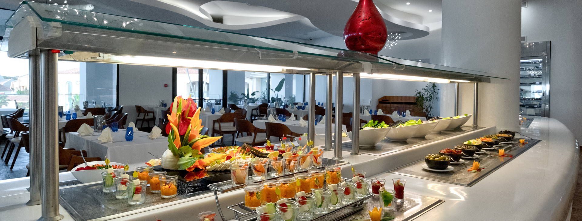 Plná penzia Plus (raňajky a večere podávané formou bufetu v hlavnej reštaurácii), obedy podávané v reštaurácii "Le Basilic" formou výberu z jedál à la carte (výber predjedla, hlavného jedla, dezertu). K večeri: 1 l vody na 2 osoby a výber jedného nealkoholického nápoja.