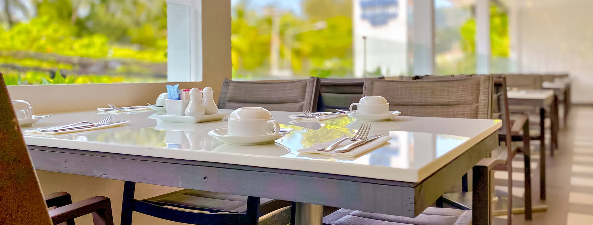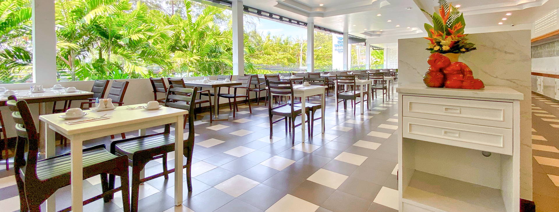 Jedlá sa podávajú v reštaurácii The Beach, ktorá ponúka autentickú thajskú a európsku kuchyňu a celý rad teplých a studených jedál. Reštaurácia sa nachádza len pár krokov od vstupnej haly. Otvorená je denne od 7.00 do 22.00