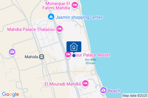 Hotel sa nachádza v pokojnej oblasti, asi 6 km od centra mesta Mahdia, ktoré je miestnym turistickým centrom; v blízkosti sa nachádzajú bary, reštaurácie a bazár (pohodlne dostupné miestnymi taxíkmi - cca 3 EUR).POZNÁMKA! Cena nezahŕňa miestnu turistickú daň 12 TND/osoba/deň. Maximálna turistická daň sa počíta za 15 po sebe nasledujúcich hotelových nocí aj pri dlhších pobytoch. Osoby mladšie ako 12 rokov sú od platenia turistickej dane oslobodené. Daň je povinná a platí sa priamo na recepcii pred ubytovaním klientov v hoteli.
