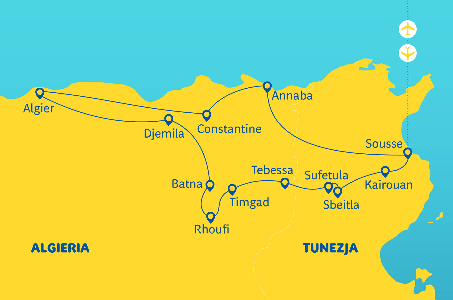 Základní cena zahrnuje: přelet charterovým letadlem na trase Polsko - Tunisko - Polsko, letištní taxy, transfery klimatizovaným autokarem na území Tuniska a Alžírska, ubytování: 7 nocí v 3* hotelech (nebo za příplatek 14 nocí), stravování: 7 snídaní a 7 obědů zaměnitelné s večeřemi; služby polského průvodce, pojištění TU Europa varianta základní (úrazové pojištění a léčebné výlohy, trvalé následky, asistenční služby a pojištění zavazadel).