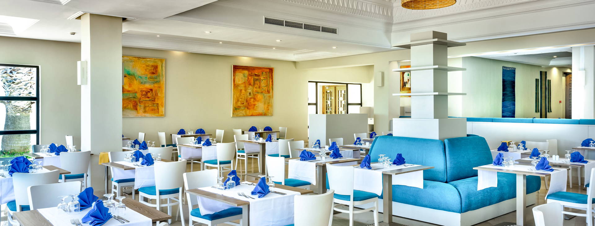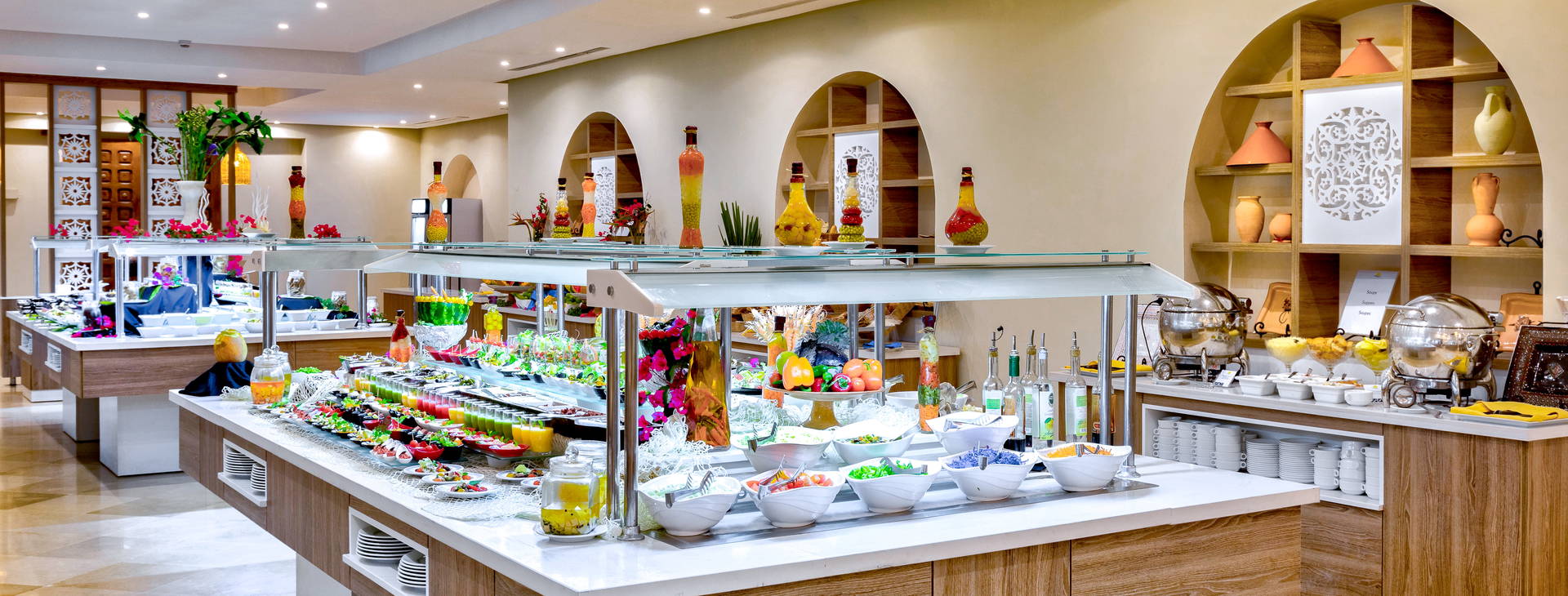 All Inclusive: raňajky (7:00 - 10:00), obedy (12:30 - 14:30) a večere (18:30 - 22:30) formou bufetu v hlavnej reštaurácii. Nealkoholické nápoje a miestne alkoholické nápoje k dispozícii v baroch v areáli hotela od 10:00 - 1:00. Raz za pobyt možnosť vychutnať si večeru v jednej z a la carte reštaurácií (nutná predchádzajúca rezervácia a dlhé nohavice). Občerstvenie počas dňa (12:30 - 15:00).