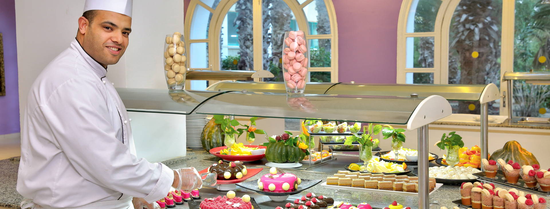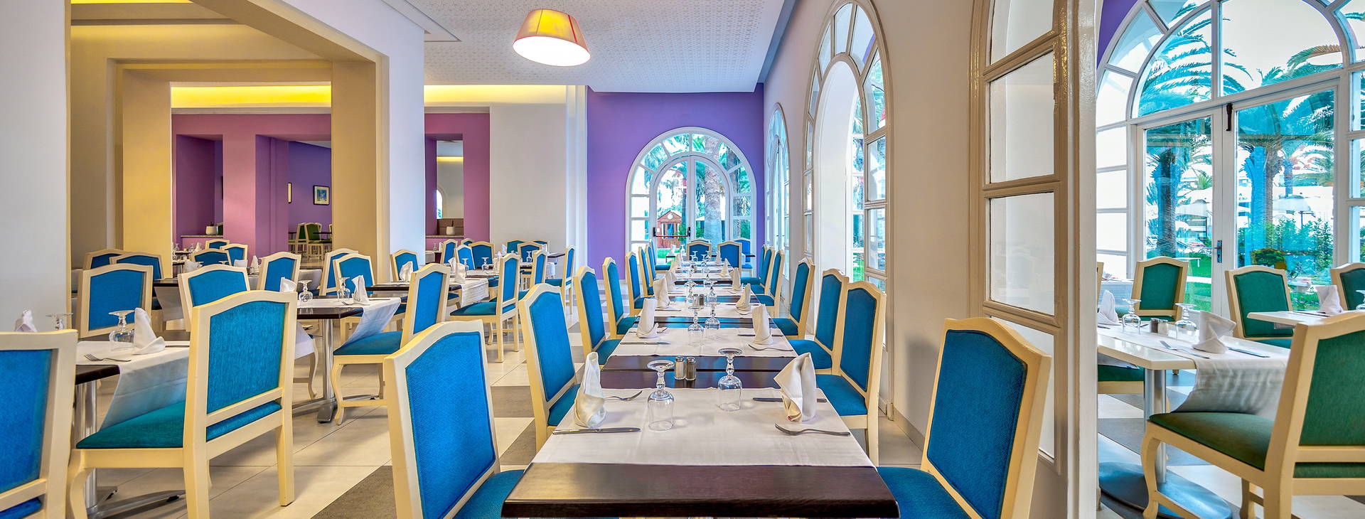 All Inclusive: raňajky (07:00-11:00), neskorá večera (v snack bare od 10:00-11:30), obed (12:30-14:00), občerstvenie (15:00-17:00 ), večera (18:30-19:30 a 19:45-21:00). Reštaurácia a'la carte s medzinárodnou kuchyňou, napr. talianskou, španielskou s kuchárskou show - rezervácia nutná vopred (1x počas pobytu zdarma, vyžaduje sa dress code). Bary: v hotelovej hale, pri vonkajšom bazéne a bezplatný lounge bar "Bar américain" a za poplatok kaviareň café maure.