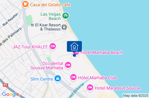 Hotel Marhaba Beach sa nachádza približne 1,5 km od centra mesta Sousse. Prístav Port El Kantaoui je vzdialený približne 5 km od hotela. Najbližšie letisko Monastir je vzdialené približne 20 km a letisko Enfidha-Hammamet približne 46 km. Obchody sa nachádzajú približne 200 m od hotela. Najbližšie golfové ihrisko je vzdialené približne 6 km. UPOZORNENIE! V cene zájazdu nie je zahrnutá pobytová taxa vo výške 3 TND/osoba/deň. Maximálna výška pobytovej taxy sa počíta za 7 po sebe nasledujúcich dní, a to aj v prípade dlhšieho pobytu v hoteli. Osoby mladšie ako 12 rokov sú od platenia pobytovej taxy oslobodené. Pobytová taxa je povinná a platí sa priamo na recepcii pri registrácii.