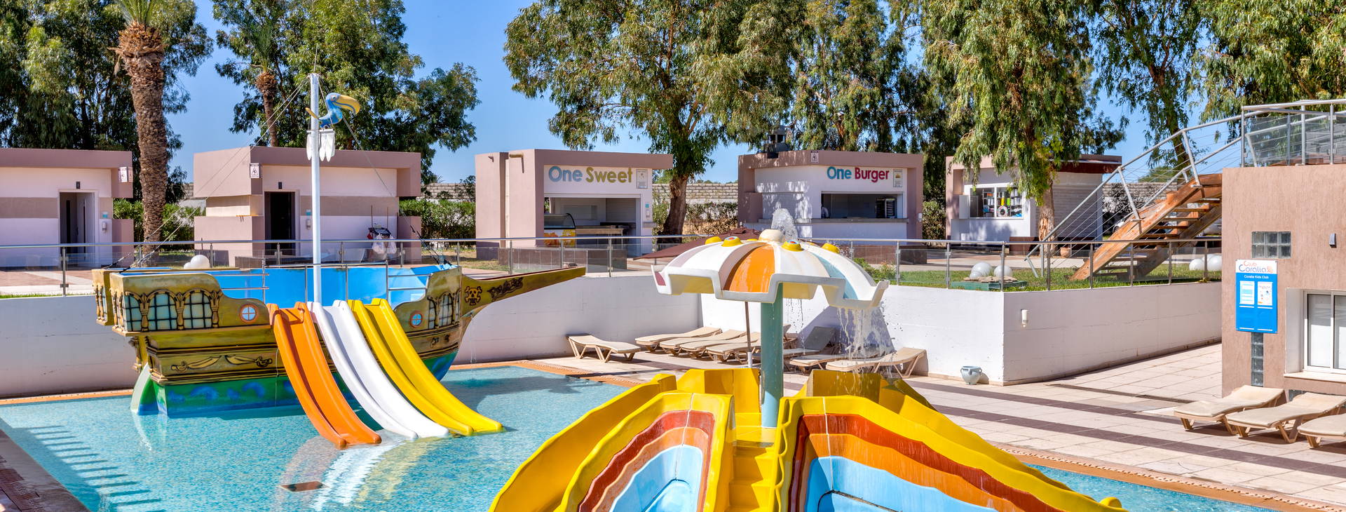 .Recepcia, vstupná hala s bezplatným Wi-Fi, zmenáreň, 3 vonkajšie bazény (1 pre osoby staršie ako 16 rokov), vnútorný bazén, detský bazén so 4 šmykľavkami (ležadlá a slnečníky pri bazéne zdarma, plážové osušky na kauciu), aquapark s 9 rôznymi šmykľavkami, hlavná reštaurácia, 4 reštaurácie a la carte, 3 reštaurácie s občerstvením, bary: lobby, diskotéka, pri bazéne, pri aquaparku, na pláži, tenisový kurt (lekcie a osvetlenie za poplatok), stolný tenis, multifunkčné ihrisko, wellness centrum (procedúry za poplatok), 3 minikluby pre deti rôzneho veku (od 3 do 17 rokov). Za príplatok: požičovňa áut, obchody, práčovňa, kaderníctvo.