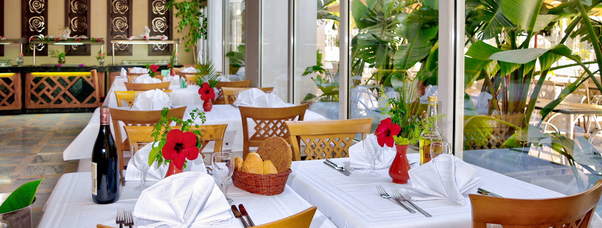 All inclusive: raňajky (6:00-09:30), obed (12:30-14:30) a večera (19:00-21:30) podávané formou bufetu v hlavnej reštaurácii. Jeden obed je možné si vychutnať v reštaurácii a la carte (rezervácia je potrebná 24 hodín vopred).
