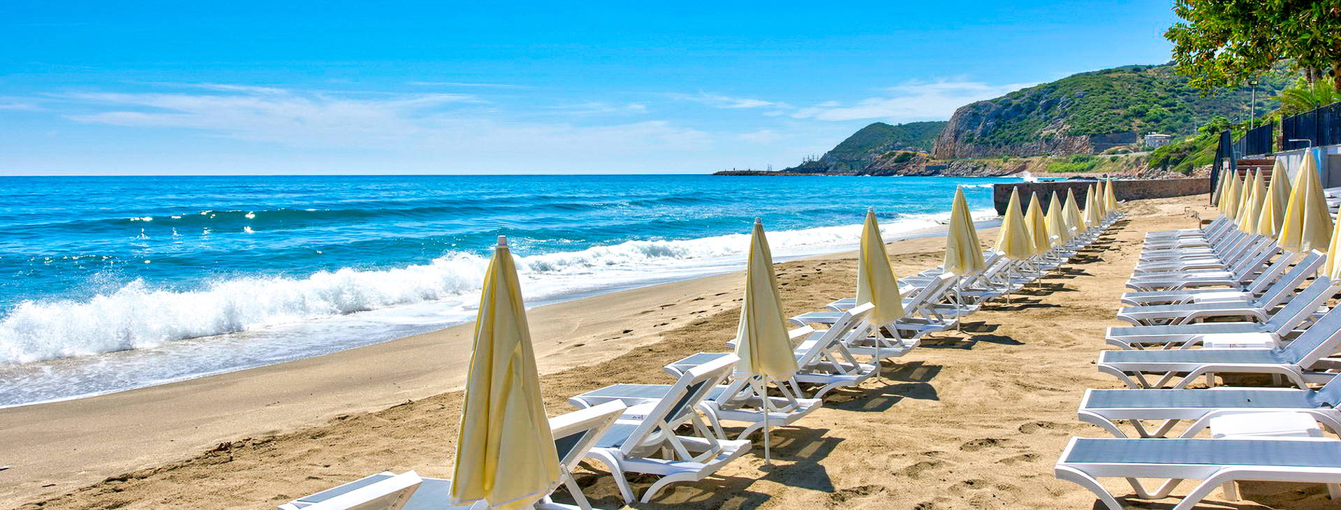 .Hotel sa nachádza priamo na známej Kleopatrinej pláži. Ležadlá a slnečníky sú na pláži k dispozícii zadarmo. Osušky na kúpanie sú k dispozícii za poplatok 2 €/ osuška/deň, záloha 5 € k dispozícii od 9:00 do 11:00. Pláž je piesočnatá s jemnými kamienkami a jej veľkosť môže závisieť od prílivu a odlivu.