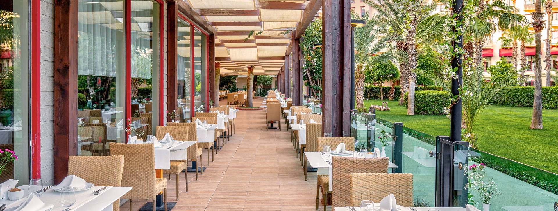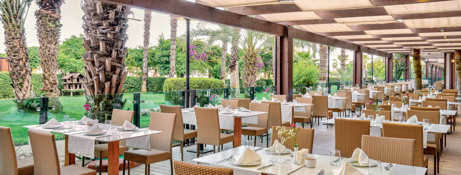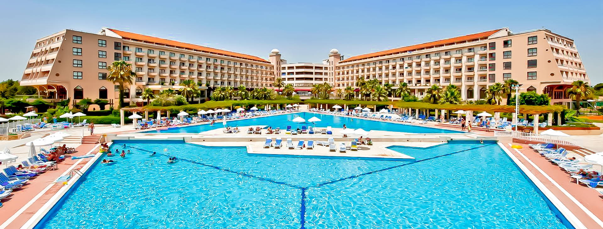 .24-hodinová recepcia, výťahy, priestranná vstupná hala, 5 reštaurácií: Hlavná reštaurácia s bohatým bufetom a a'la carte reštaurácie: talianska, ázijská, turecká a grilovaná kuchyňa (možnosť výberu raz za pobyt, nutná rezervácia vopred). 4 bary: v lobby 24 hodín denne, pri bazéne (10:00-24:00), na pláži (11:00-17:00) a disco bar (23:30-02:00); 2 vonkajšie bazény, detský bazén, bazén so šmykľavkami a vnútorný bazén. Za poplatok: požičovňa áut, práčovňa, kaderníctvo, lekár, obchody.