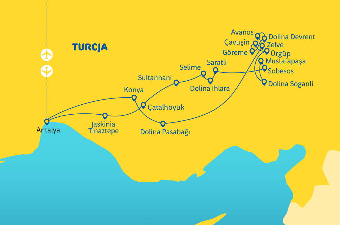 Sraz u stanoviště Rainbow 2 hodiny před plánovaným odletem letadla na jednotlivých letištích. Aktuální letové řády sledujte na R.pl/rozklady. Odlet do Antalye. Po příletu transfer do hotelu v Antalyi, setkání s průvodcem. Volný čas. Klienti, kteří přiletí pozdě večer, nemají v tento den večeři, místo toho dostávají balíčky s jídlem. (Trasa cca 20 km)
