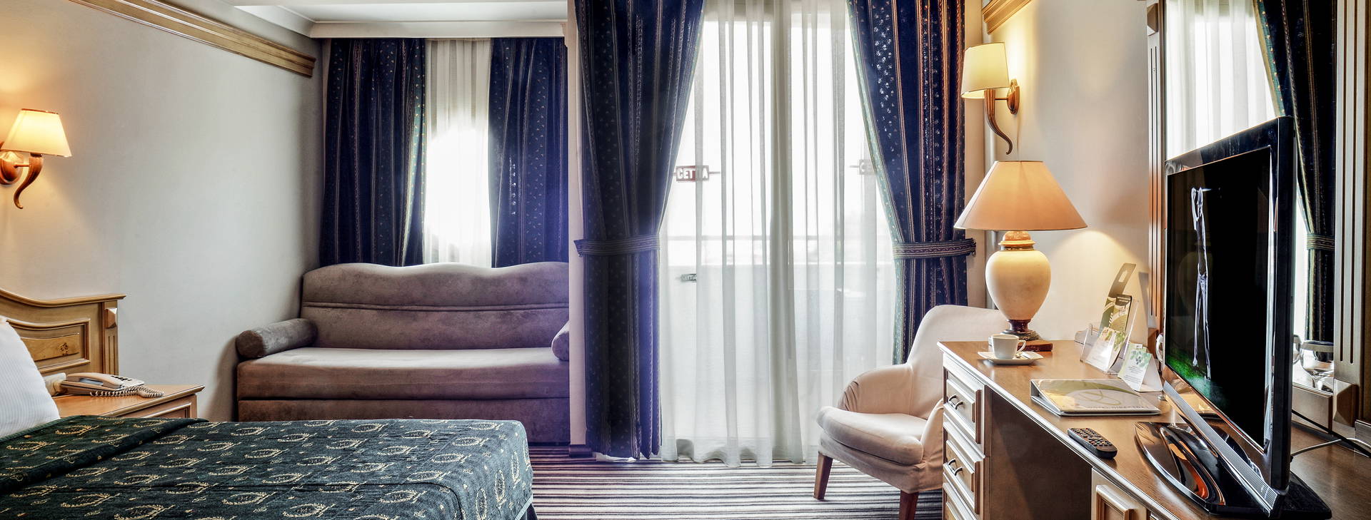 All inclusive: skoré raňajky (7:00-7:30), raňajky (07:30-10:00), neskoré raňajky (10:00-11:00), obed (12:30-14:00) a večera (19:30-21:30) formou bohatého bufetu v hlavnej reštaurácii. Občerstvenie počas dňa (12:30-14:00 a 14:30-17:00), coffee break so sladkým občerstvením (11:00-18:00) okrem nedele, nočná polievka (24:00-00:30). Miestne nealkoholické a alkoholické nápoje (10:00-23:00), zmrzlina (utorok až nedeľa 16:00-17:00). Za príplatok: dovážané liehoviny, turecká káva a čerstvo vylisované džúsy.