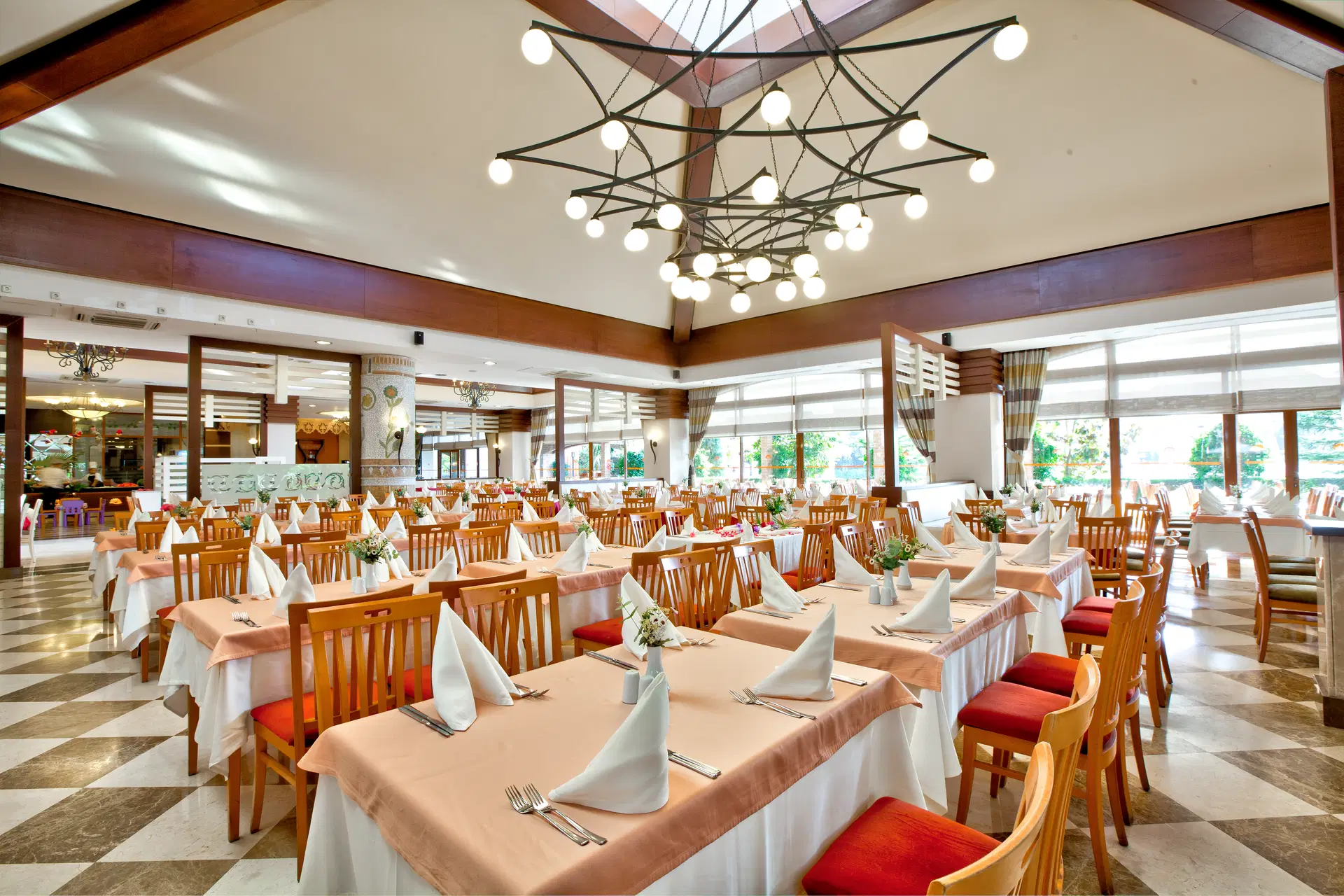 Ultra All Inclusive: raňajky, neskoré raňajky, obedy a večere formou bohatého bufetu, popoludňajšie občerstvenie a zmrzlina. Miestne nealkoholické a alkoholické nápoje a niektoré importované nápoje (whisky, rum, vodka, gin, likéry - vybrané značky), ako aj teplé nápoje a koláče k dispozícii v lobby bare 24 h. A'la carte reštaurácie k dispozícii po predchádzajúcej rezervácii (rezervačný poplatok cca 10 EUR - reštaurácia s morskými plodmi). Za príplatok: ostatné dovážané nápoje (nealkoholické a alkoholické), fľaškové nápoje a čerstvé ovocné šťavy. V hlavnej reštaurácii sú k dispozícii detské jedlá a bezlepkové jedlá.