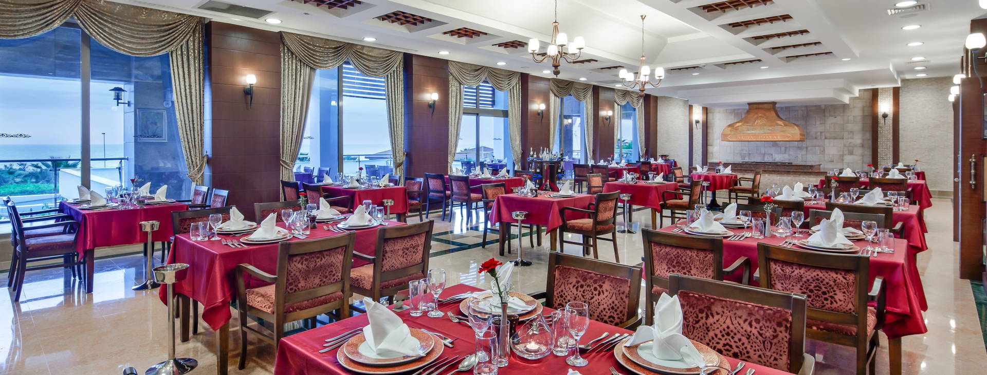 Ultra All Inclusive: raňajky (7:00-10:00), neskoré raňajky (10:00-10:30), obedy (12:30-14:00) a večere (19:00-21:00) formou bufetu. Nočné občerstvenie (23:30-6:00) v hlavnej reštaurácii, občerstvenie (koláče, zmrzlina, slané občerstvenie) podávané v bare pri bazéne (11:00-16:00) a v plážovom bare (12:00-17:00). Niekoľkokrát týždenne tematické večere s tureckými špecialitami. Miestne značkové alkoholické nápoje, nealkoholické nápoje, džúsy, voda, turecká káva a čaj k dispozícii 24 h vo vybranom bare, v ostatných počas otváracích hodín.