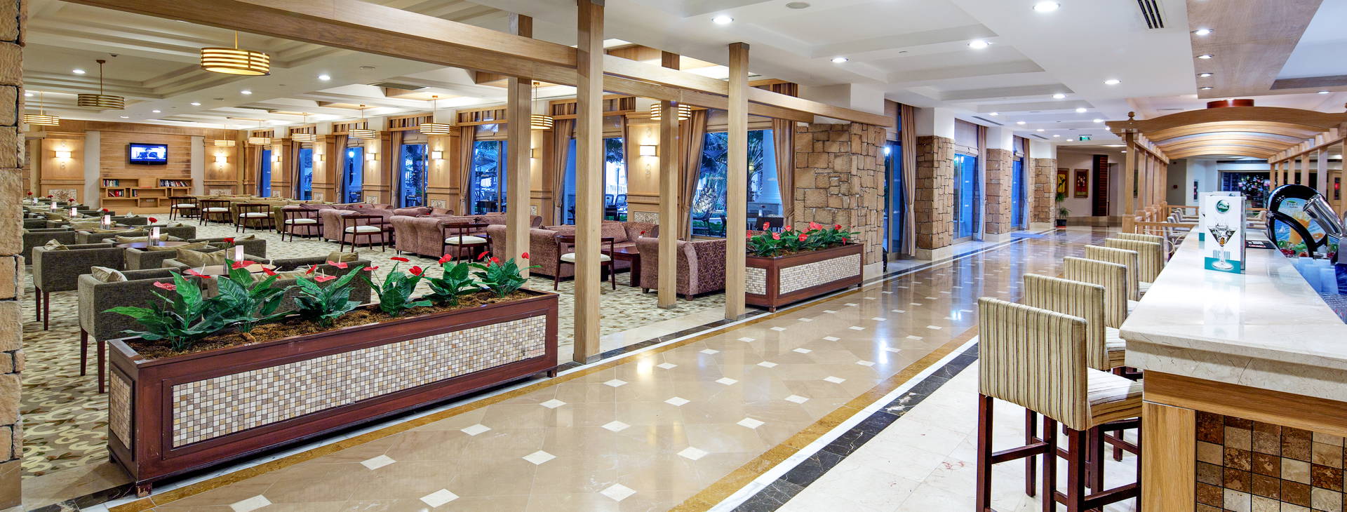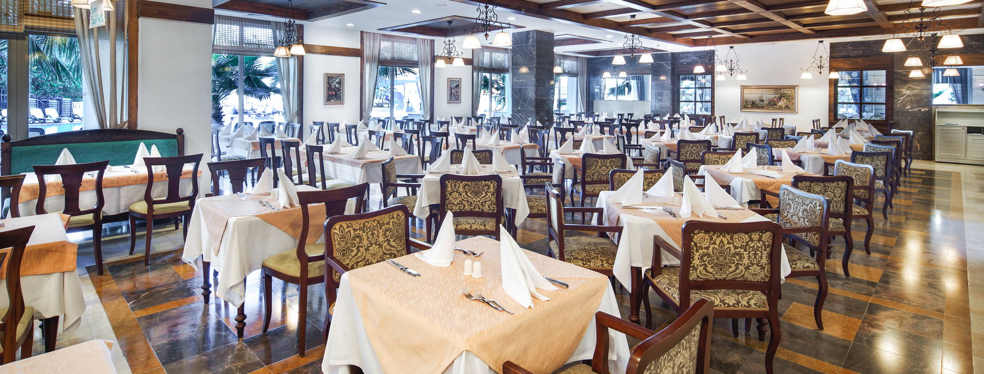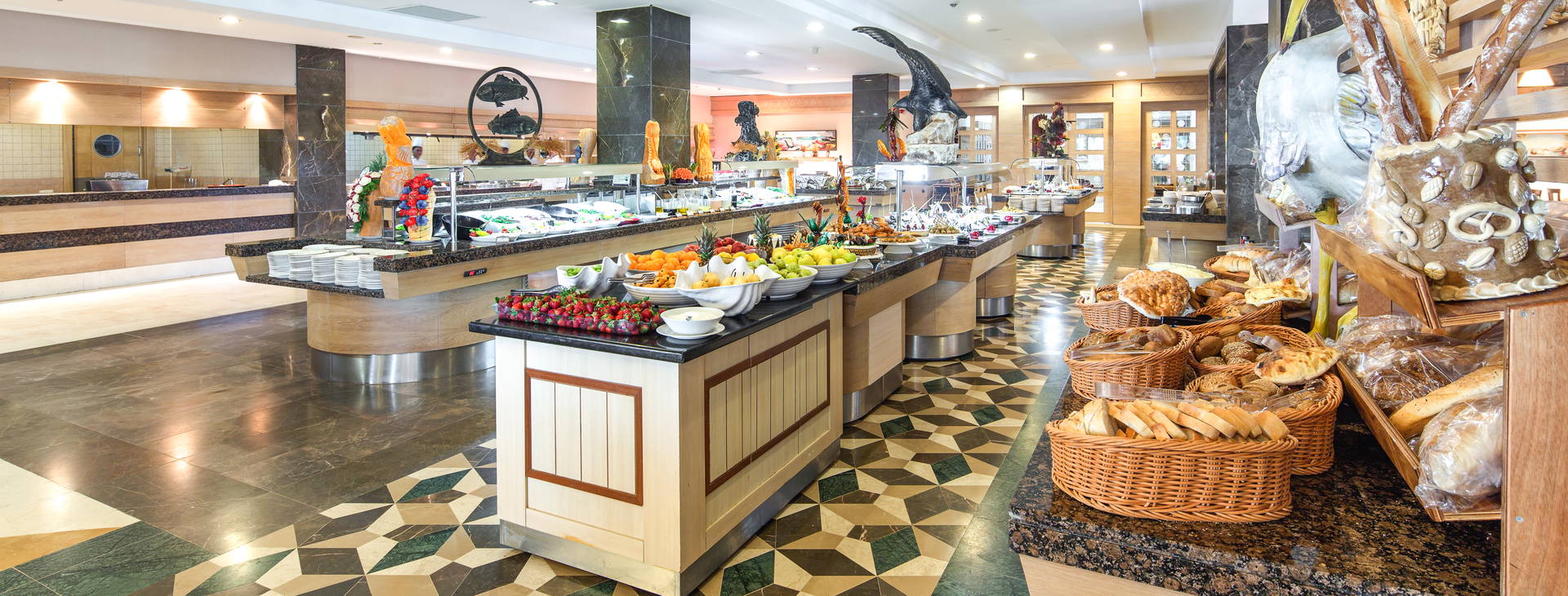 .All Inclusive: raňajky (7:00-10:00), neskoré raňajky (10:00-10:30), obedy (12:30-14:00) a večere (19:00-21:00) formou bufetu. Nočné občerstvenie (23:30-6:00) v hlavnej reštaurácii, občerstvenie (koláče, zmrzlina, slané občerstvenie) podávané v bare pri bazéne (11:00-16:00) a v plážovom bare (12:00-17:00). Niekoľkokrát týždenne tematické večere s tureckými špecialitami. Miestne značkové alkoholické nápoje, nealkoholické nápoje, džúsy, voda, turecká káva a čaj k dispozícii 24 h vo vybranom bare, v ostatných počas otváracích hodín. Čerstvo vylisované džúsy a dovážané liehoviny za príplatok.