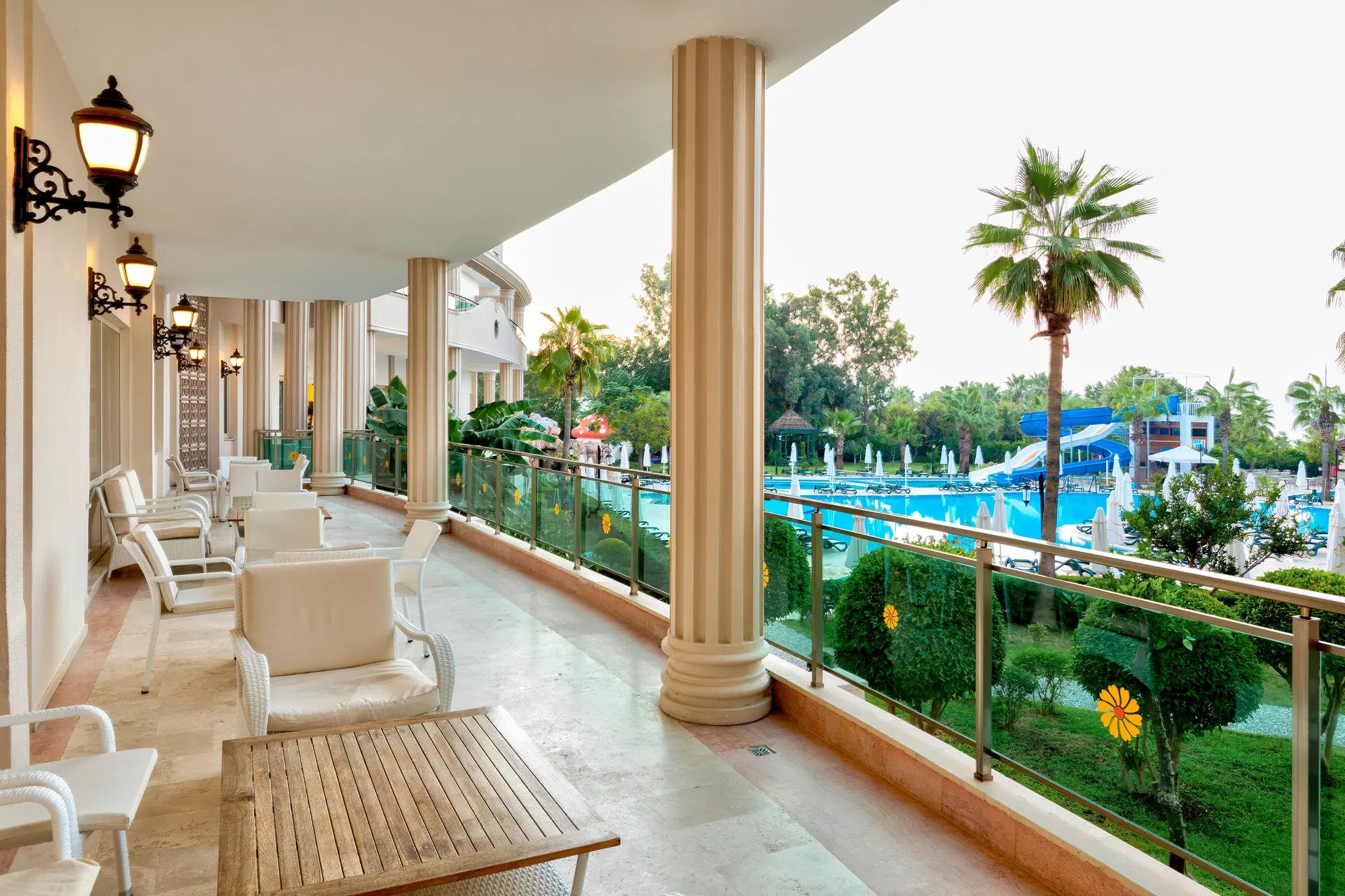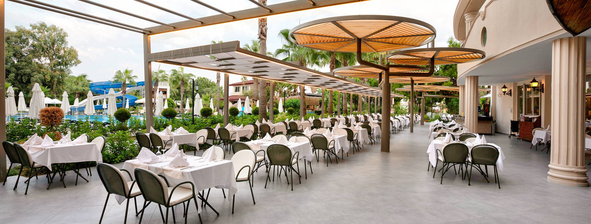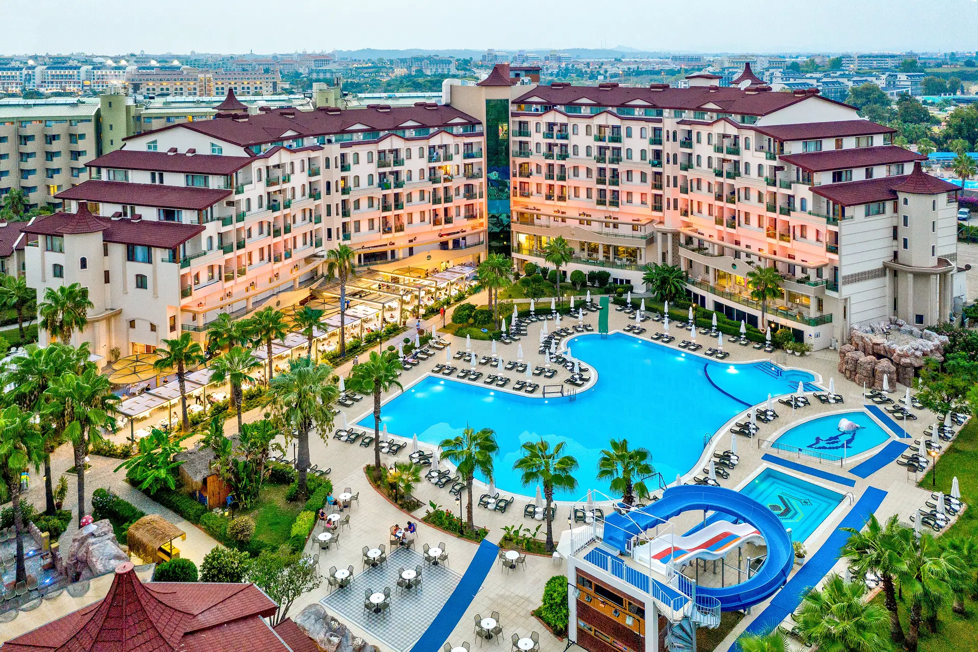24-hodinová recepcia, vstupná hala, hlavná reštaurácia, 4 bary: lobby bar, disco bar, bar pri bazéne a bar na pláži, 3 reštaurácie a'la carte (jedna večera v jednej vybranej reštaurácii počas pobytu zdarma - nutná predchádzajúca rezervácia).6 bazénov vrátane hlavného vonkajšieho bazéna, vnútorného bazéna (vyhrievaný na začiatku a na konci sezóny), vonkajší a vnútorný detský bazén, 2 bazény so šmykľavkami. Za poplatok: prenájom auta, práčovňa, lekár, obchody.