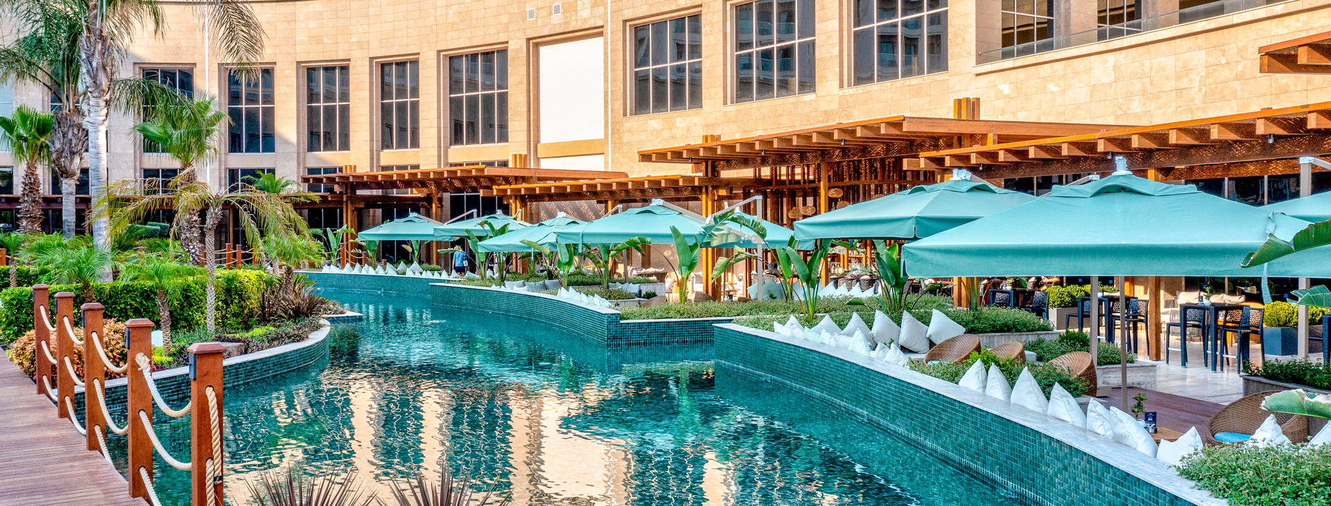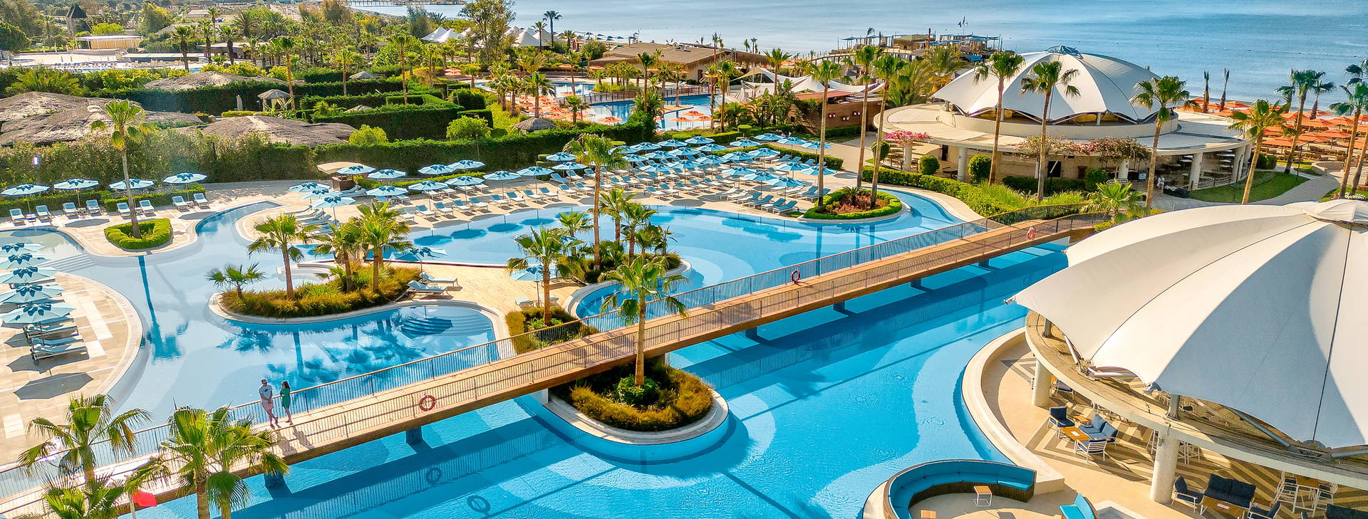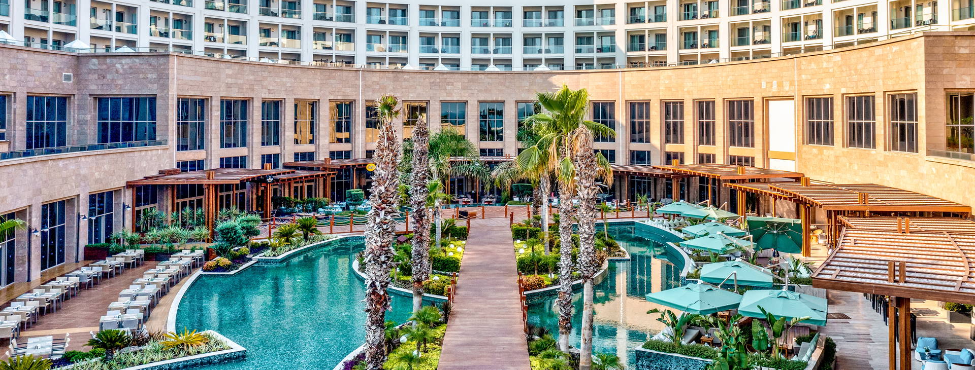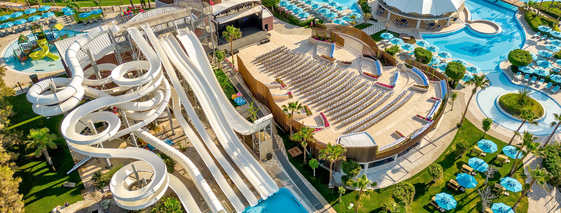 Recepcia, hlavná reštaurácia The Palazzo, oddelená časť detskej reštaurácie s detským menu, 5 a'la carte reštaurácií: ázijská, talianska, turecká, steaková a rybia (za príplatok, nutná rezervácia vopred). LIVIO snack reštaurácia a cukráreň so širokým výberom zákuskov. Pre hostí izieb Luxury Lagoon Suites je k dispozícii špeciálna reštaurácia Lagoon. Hosťom je k dispozícii 9 barov (Golf Club Bar a Lagoon Bar za príplatok). V areáli hotela: hlavný bazén, detský bazén, 2 vnútorné bazény, relaxačný bazén, bazén s morskou vodou. Aquapark s bazénmi (7 toboganov, vodná veža pre deti). Ležadlá, slnečníky a osušky k dispozícii bez príplatku. Za príplatok: obchody, fotograf, požičovňa áut, služby práčovne, kaderníctvo, opatrovateľka detí.
