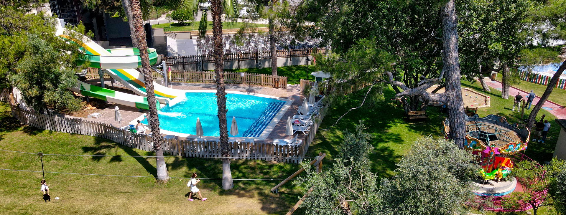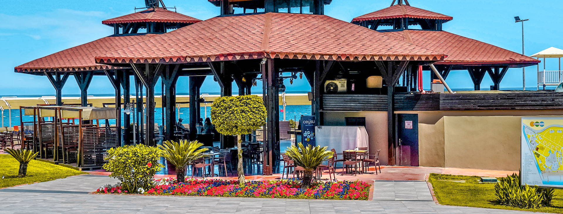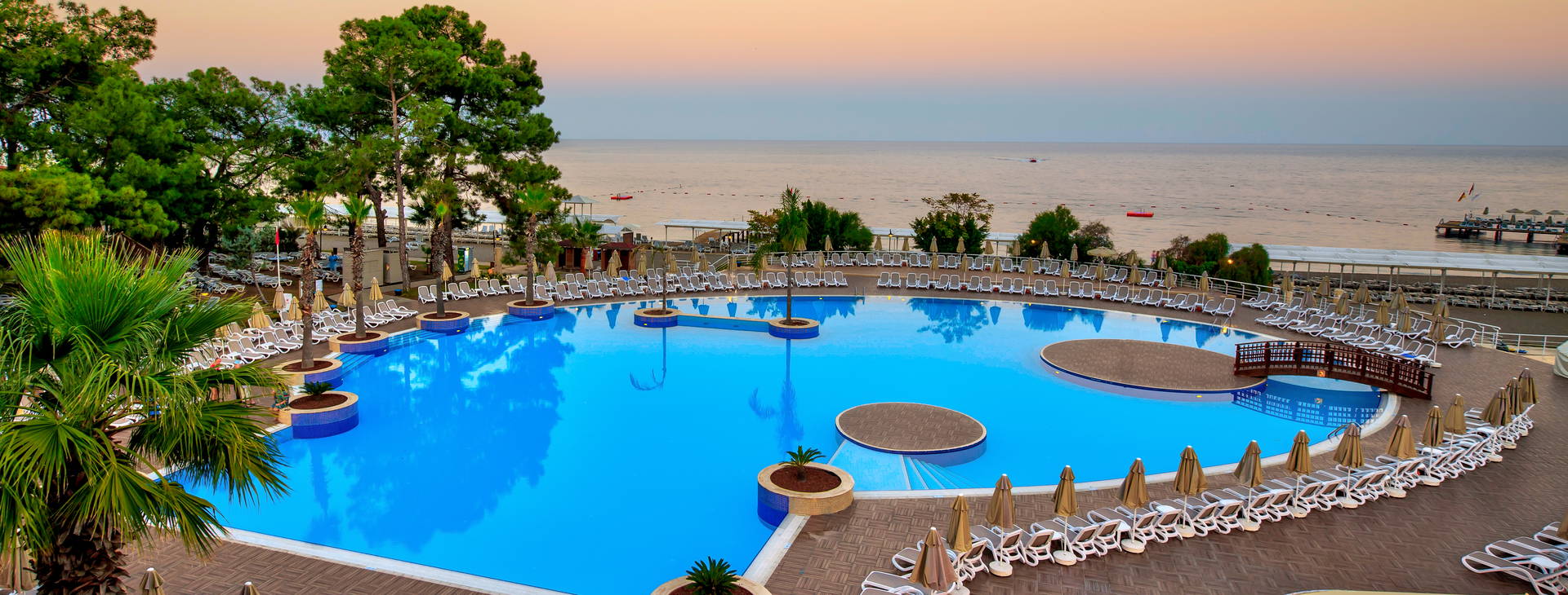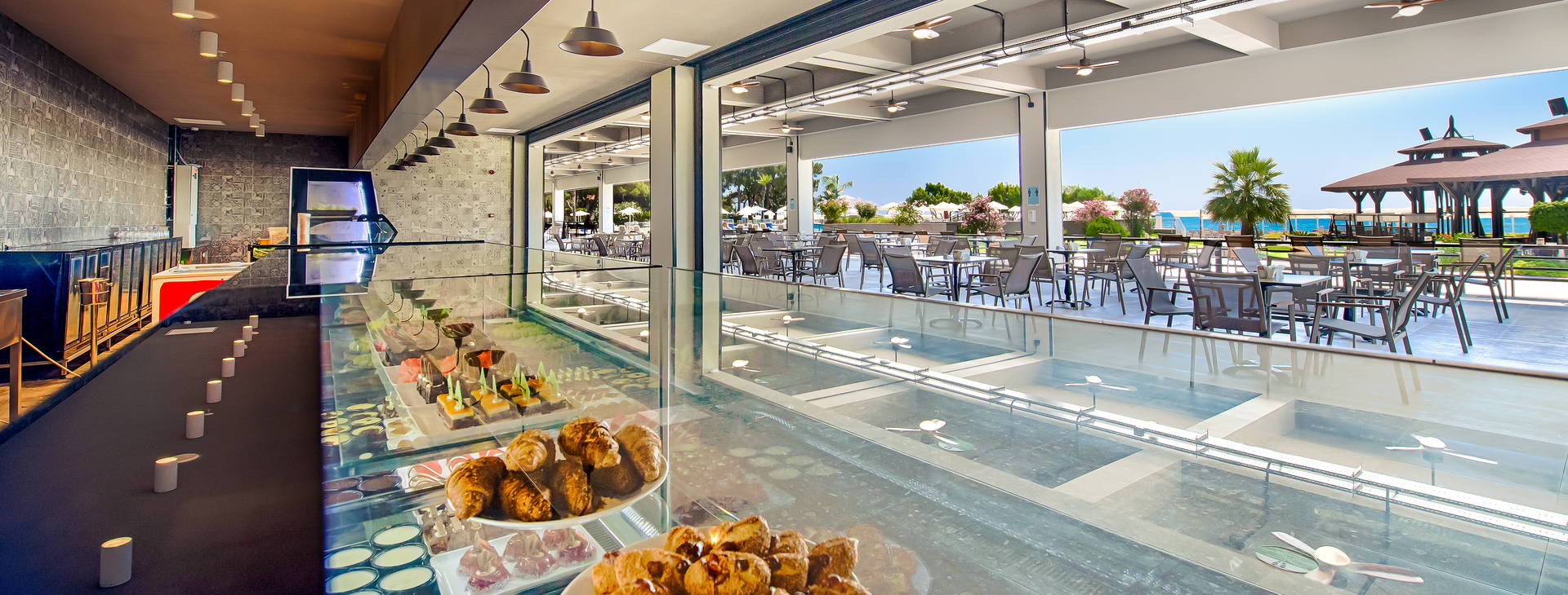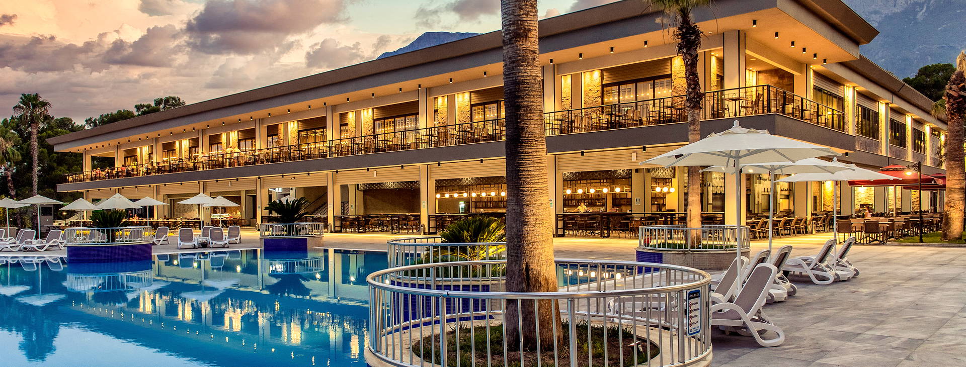 Recepcia, vstupná hala, hlavná reštaurácia s niekoľkými stolmi na terase s výhľadom na bazény a more, reštaurácia a'la carte (za príplatok cca 50 EUR/osoba, nutná rezervácia), food court s ponukou občerstvenia a'la carte (vrátane talianskych jedál, hamburgerov, morských plodov, polievok, kebabu), 6 barov vrátane: lobby, pri bazéne, Spa, cukráreň. Bazény: hlavný bazén, relaxačný bazén, detský bazén, šmykľavky pre deti a dospelých. Pre deti: miniklub, detské ihrisko a animácie podľa hotelového programu. Za poplatok: požičovňa áut a bicyklov, práčovňa, trh, lekár.