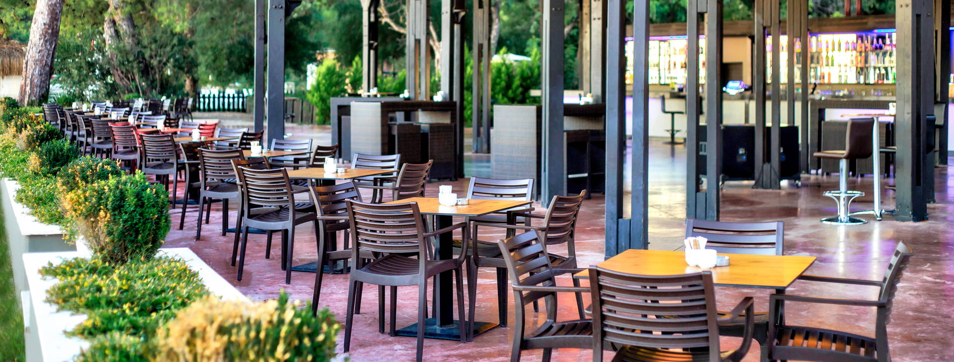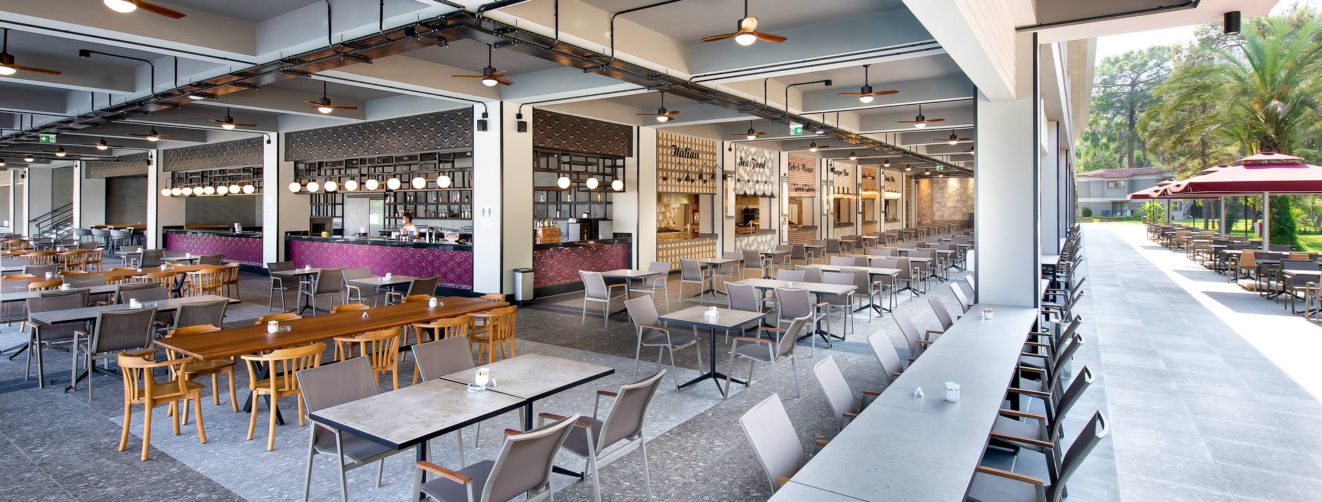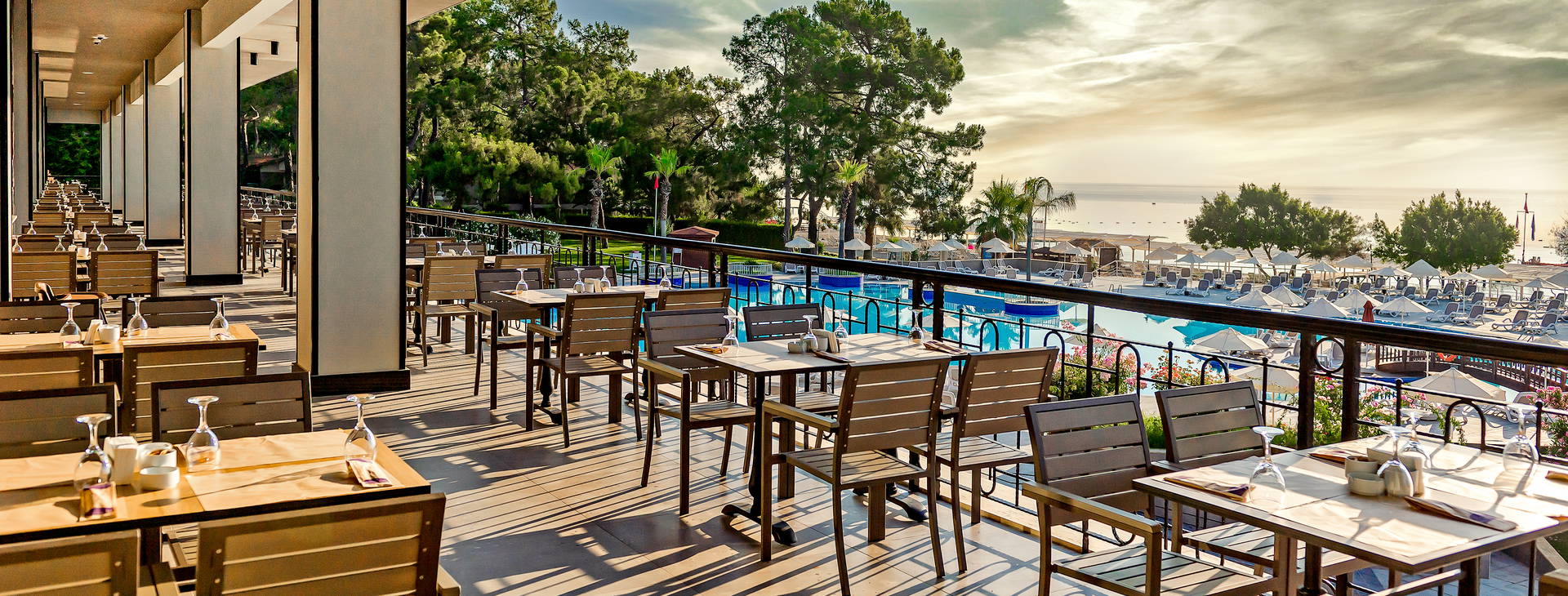Ultra All Inclusive: raňajky (07:00-10:00), neskoré raňajky (10:00-11:00), obed (12:30-14:00), večera (19:00-21:00), neskorá večera (24:00-06:00):00) ako bohatý bufet v hlavnej reštaurácii, široký výber občerstvenia vo Food Court (11:00-18:00), tradičná turecká pochúťka gözleme (11:00-16:00), dezerty (11:00-24:00), zmrzlina (12:00-18:00). Nealkoholické nápoje, miestne alkoholické nápoje a vybrané dovážané alkoholické nápoje sú k dispozícii 24 hodín denne vo vybranom bare.