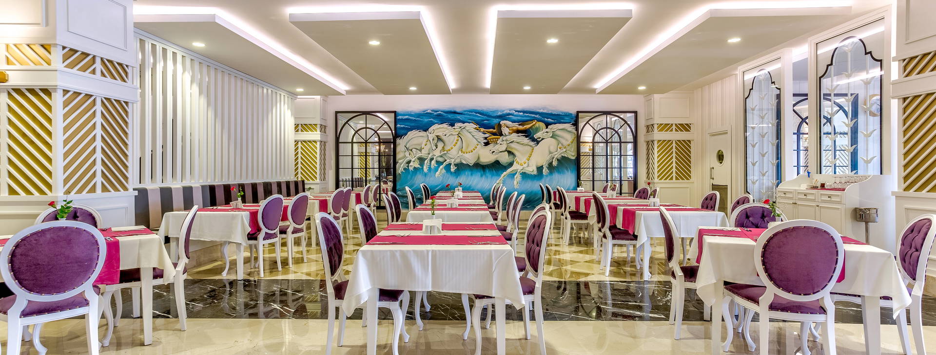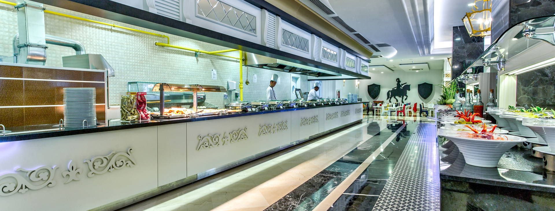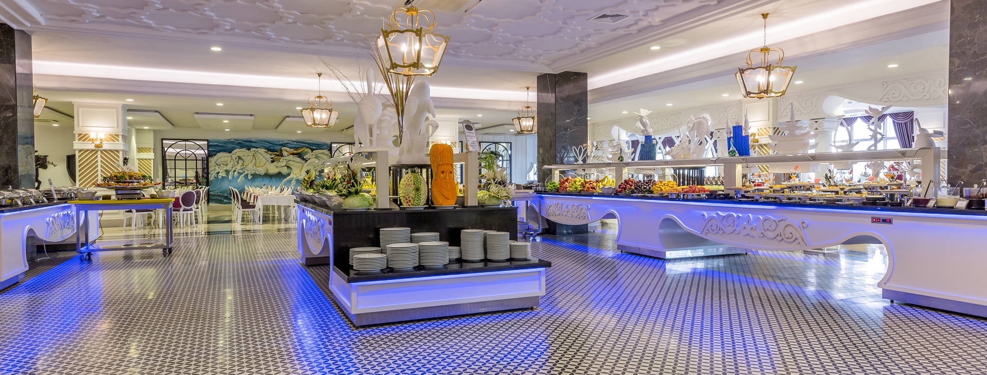 All Inclusive: raňajky (07:00-10:00), neskorá večera (10:00-10:30), obed (12:30-14:00), večera (18:30-20:30) formou bufetu. Okrem toho nočné občerstvenie (23:00-07:00) v hlavnej reštaurácii, občerstvenie ako zmrzlina, vafle, koláče, gözleme torty (12:00-17:00), cukráreň (12:00-18:00). Miestne alkoholické a nealkoholické nápoje k dispozícii v baroch počas otváracích hodín. Za príplatok: importované alkoholické a nealkoholické nápoje, fľaškové nápoje, nápoje v disco bare, čerstvé ovocné šťavy.